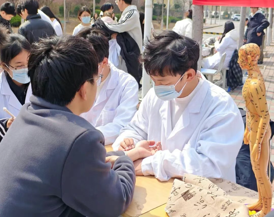 报告厅主题活动结束后,学院在综合楼北广场开展公益义诊与健康体验活动。中医药专业师生现场提供推拿按摩、艾灸理疗、香囊制作等特色体验活动,将课堂所学转化为实操能力,在服务师生中锤炼技能、践行医者担当。活动形式丰富、参与度高,既让师生切身感受中医适宜技术的独特疗效,也充分展现了力明学院中西医结合教育的实践成果。