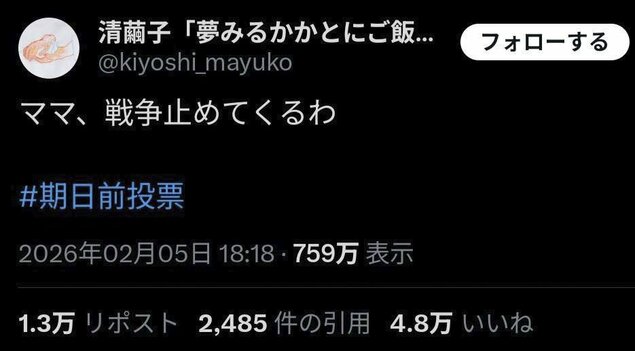 当时,舆论普遍预测自民党将获胜。从未参与过政治活动的清茧子特意在2月5日提前投票,“希望能稍微改变一下结果”。出门前,她对孩子开玩笑说“妈妈去阻止战争了”。清茧子在投票站排队时又随手将这句话发到了社交媒体X上,没想到竟然“火了”,点赞量4.8万,话题标签被转发超过700多万次,登上日本热搜榜第一名。更让清茧子想不到的是,网友在帖文下接力,迅速衍生出“爸爸也去阻止战争”“奶奶也去”“歌手也去”等,被称为“和平的病毒式传播”。