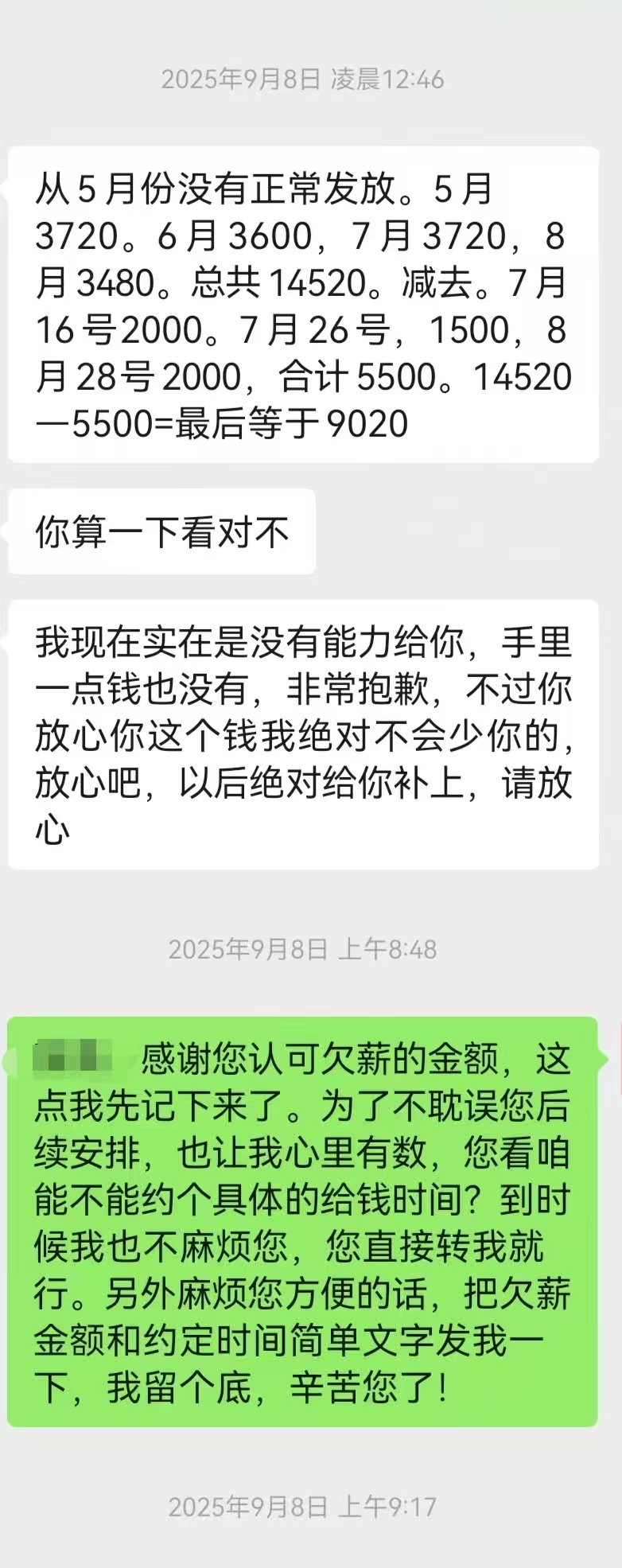 随后,记者又联系了刘女士的同事刘娜(化名)。刘娜称,闭店后,她曾多次通过微信联系店铺负责人。她提供的聊天记录显示,闭店10天后,在2025年9月8日凌晨,店铺负责人曾发来一条详细的计算信息,列出刘娜从5月至8月的工资及已发金额,确认共欠薪9020元,并称“我现在实在是没有能力给你,不过你放心,这个钱绝对不会少你的”。