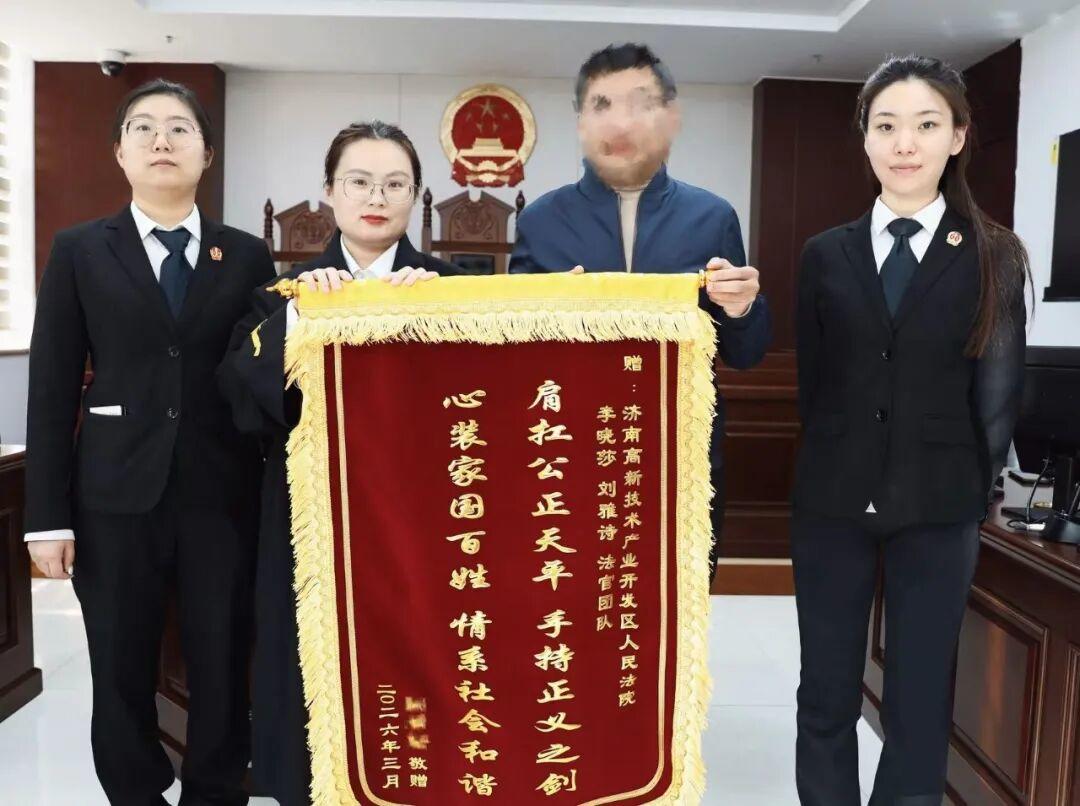 近日,当事人刘先生将一面锦旗送到济南高新区人民法院立案庭速裁团队李晓莎法官手中,用最质朴的方式,向高效办案、切实维护群众利益的法官们表达由衷的感谢与敬意。