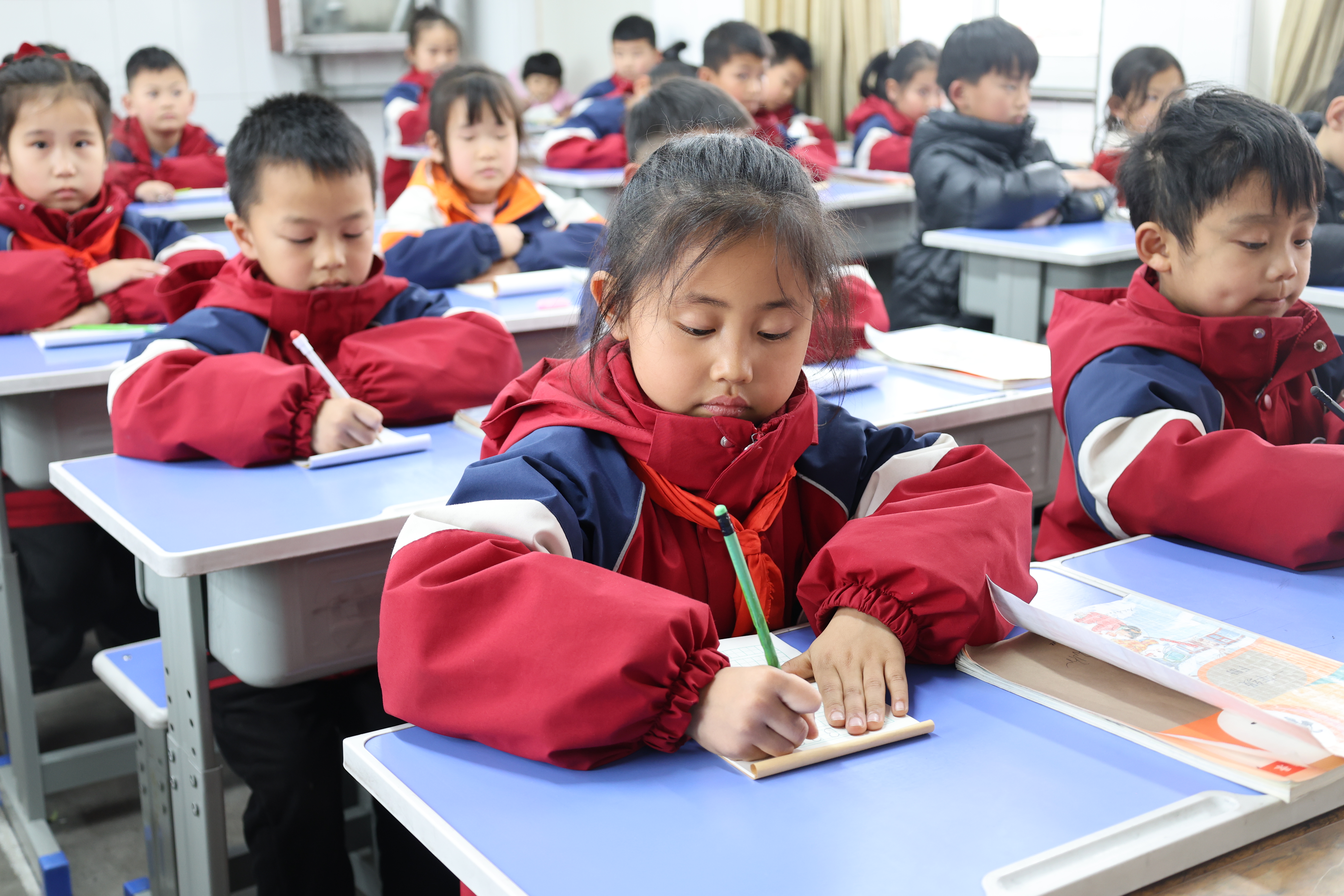 朗读时,孩子们姿势端正、声音整齐,读书节奏感强;书写环节,孩子们腰背挺直、执笔规范,字迹工整,体现了学校对学生书写习惯的高度重视。