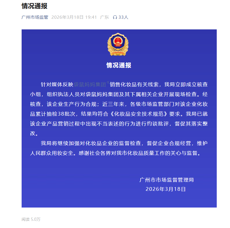 3月18日,广州市市场监管局发布情况通报称,针对媒体反映袋鼠妈妈集团销售化妆品有关线索,广州市市场监管局立即成立核查小组,组织执法人员对袋鼠妈妈集团及其下属相关企业开展现场检查。