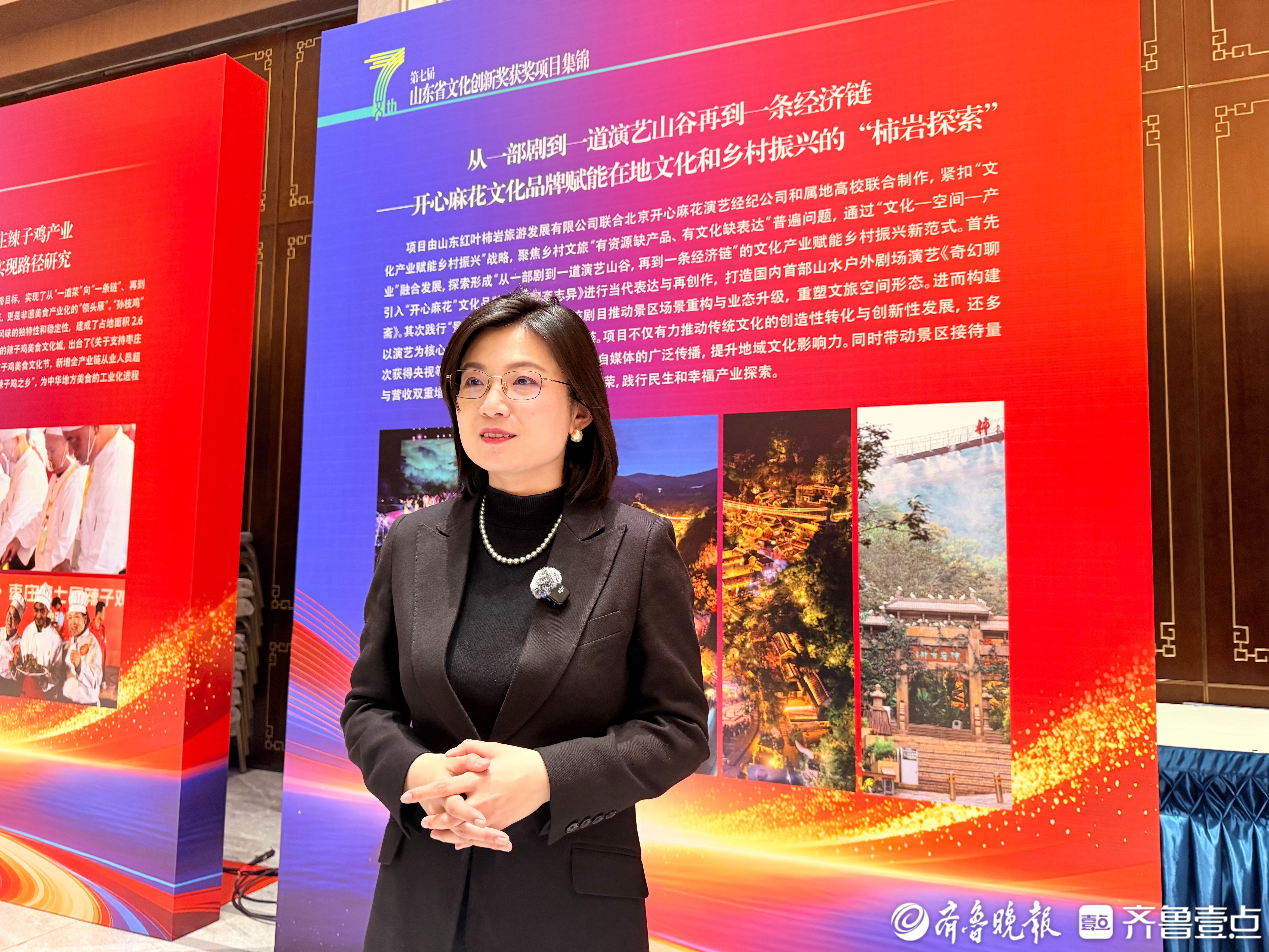 本届文化创新奖获奖项目,“演艺产业链赋能乡村振兴”项目负责人,山东青年政治学院讲师邢琦娜在会上介绍了该演艺的打造经过。2024年,红叶柿岩携手开心麻花团队,挖掘淄博籍历史文化名人——被誉为“世界短篇小说之王”的蒲松龄,以及他的著作《聊斋志异》,聚力打造《奇幻聊斋》演艺大戏。以音乐剧的艺术形式再现蒲松龄先生笔下狐仙与书生的爱情故事,还融合喜剧基因,将狐仙小翠故事改编为“勇敢追爱与成长”的叙事,为经典IP注入鲜活的时代精神,实现传统文化的年轻化表达。