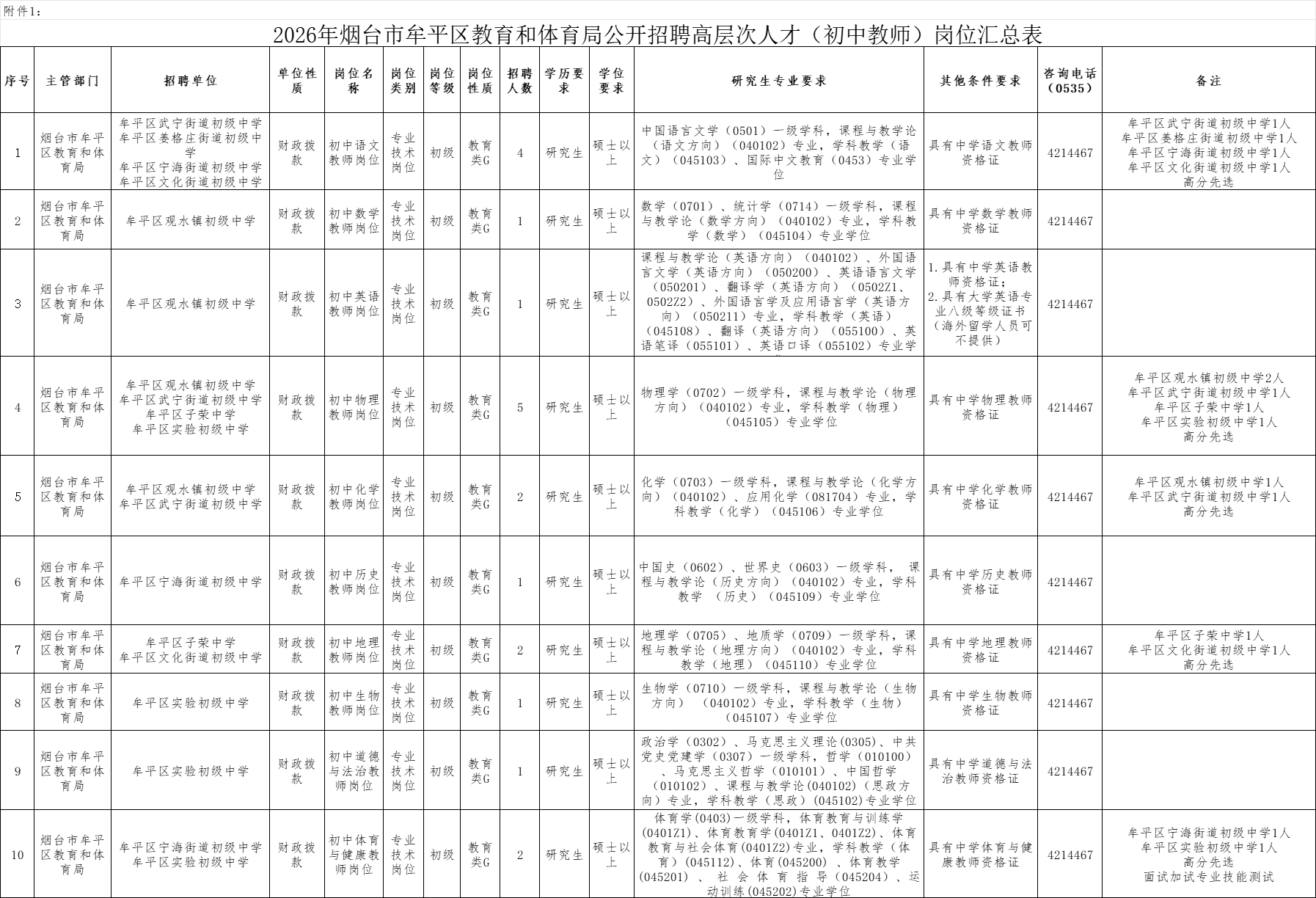 3月20日,烟台市牟平区教育和体育局发布公开招聘高层次人才(初中教师)公告,面向社会招聘20名高层次人才到初中任教,学历要求研究生,学位要求硕士以上,考试采取直接面试的方式进行,同一岗位资格审查通过人数较多的增加初试环节。具体岗位如下:
