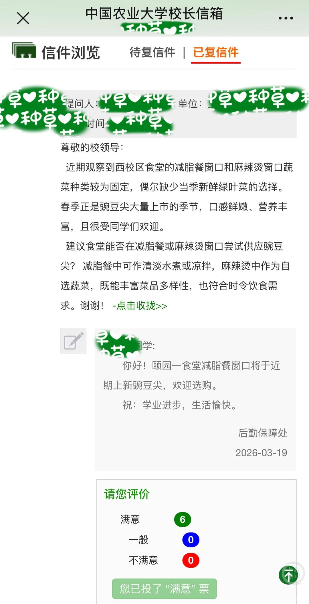 太宠了!中国农大学生建议减脂餐加豌豆尖,校长信箱直接安排下周供应