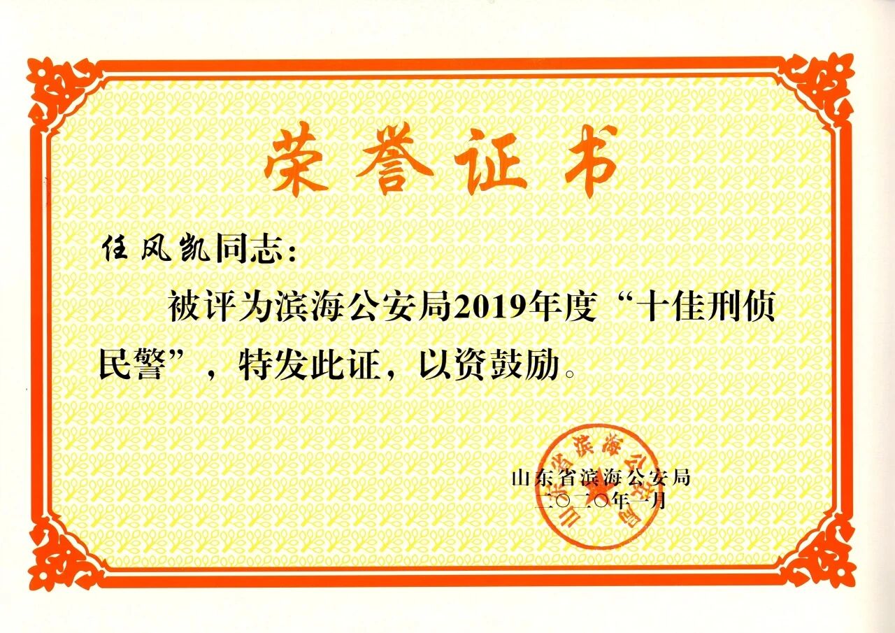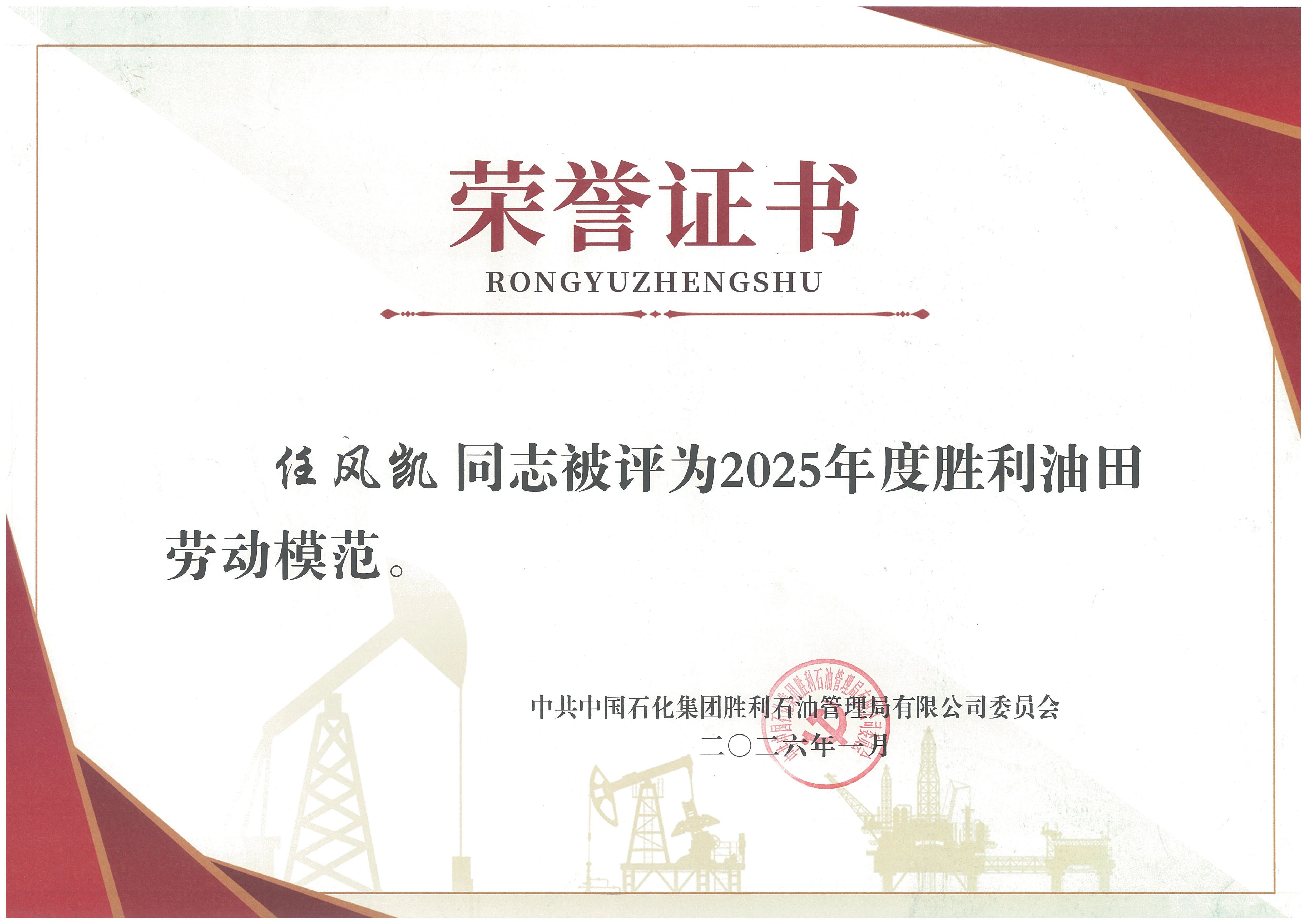 2026年1月,滨海公安局刑侦支队技术科民警任风凯被评为“2025年度胜利油田劳动模范”,中共中国石化集团胜利石油管理局有限公司委员会颁发荣誉证书。