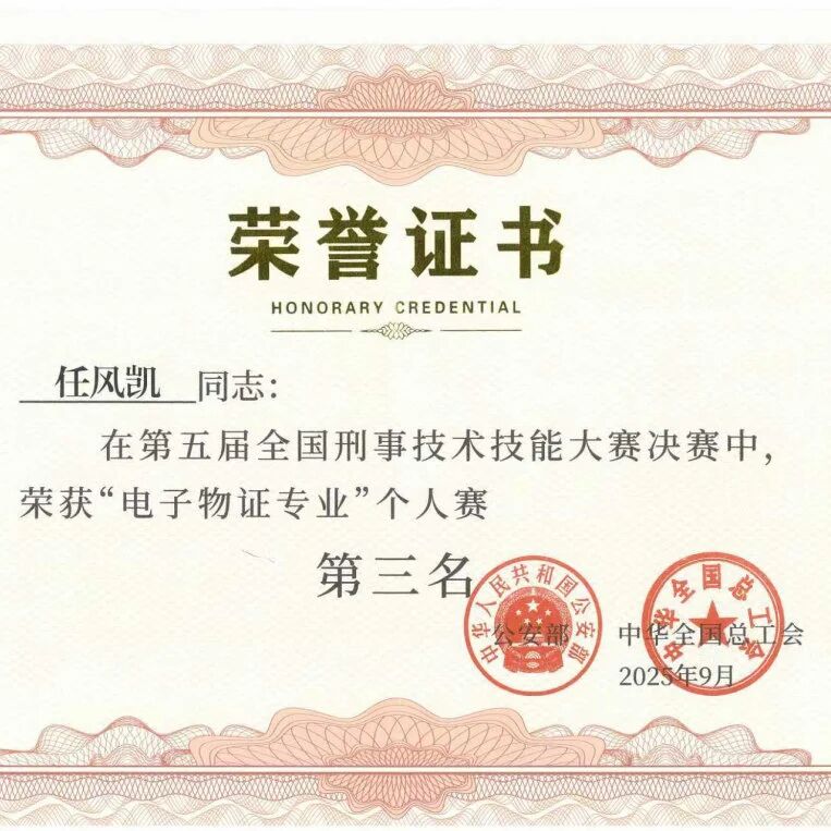 2023年8月10日,我有幸收到公安部刑侦局特别邀请,为全国民警授课,我讲授的数据实战和取证程序开发等课程,受到听众一致好评,此后,公安部多次邀请我为全国民警授课。我感到既光荣又激动,能够在公安机关最高的讲台上与同行切磋交流,是我的荣幸,也是我不断前进的力量。2021年被省厅评为全省公安实战大练兵标兵教官。2022年被评为“齐鲁警察之星”,记个人二等功;2023年11月,省厅为滨海公安局实验室授牌“任风凯电子物证工作室”,为全省首批个人专家工作室。在2024年的警察节上,我被省厅授予齐鲁最美警察提名奖。