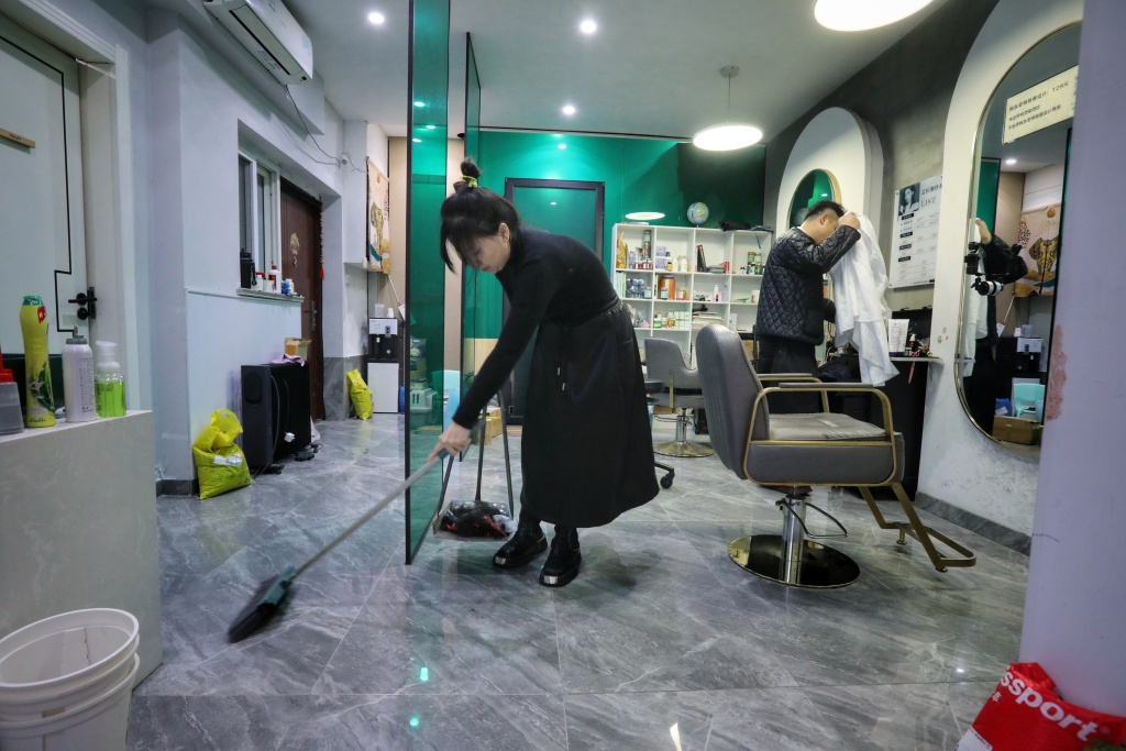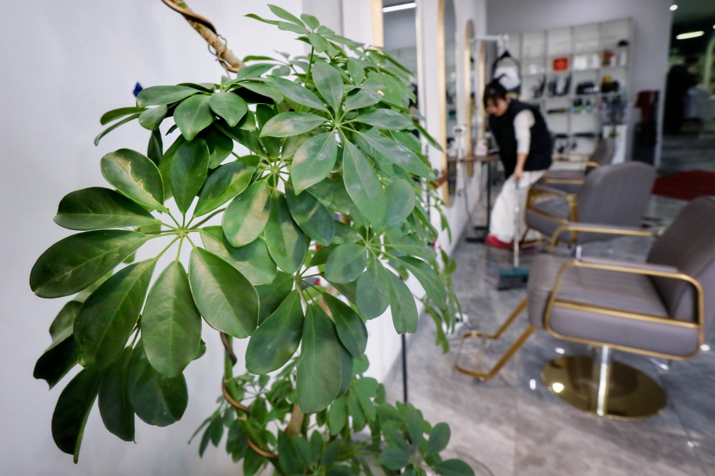 趁着顾客的间隙,姗姗赶紧打扫着地上的碎发,店内摆放着不少她精心养护的植物。