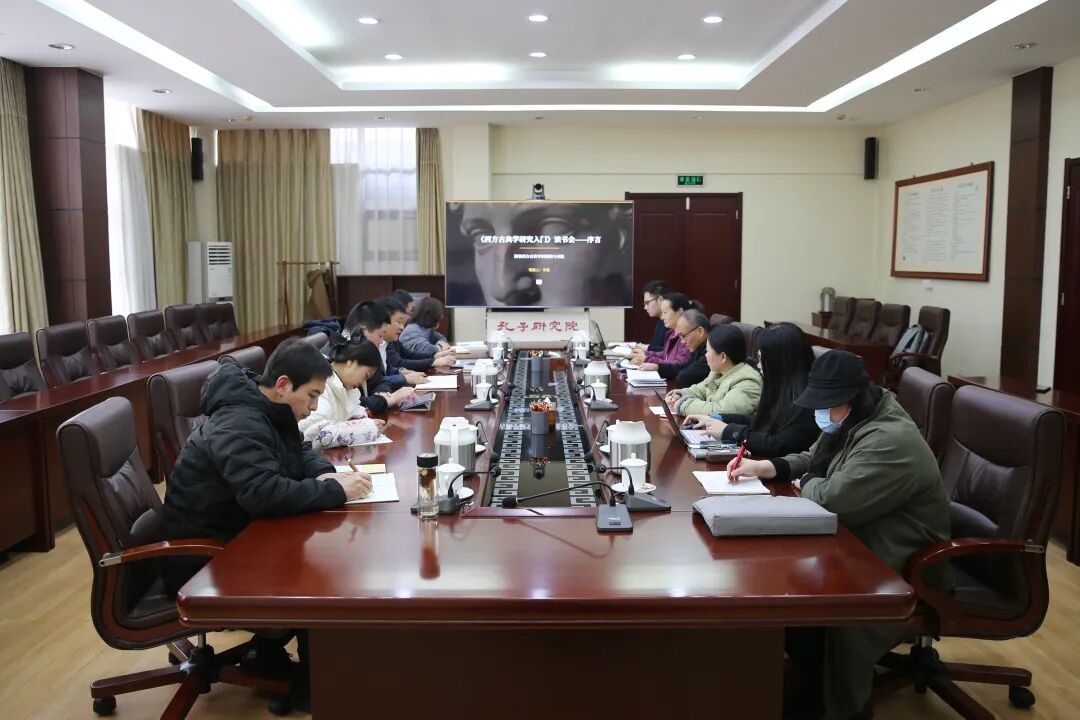 3月19日,孔子研究院中西古典学研究中心(以下简称“中心”)举办首场读书会活动。孔子研究院党委副书记、院长、中心主任孔德立研究员出席读书会,中心副主任陈松博士主持活动,辛敬博士解析《西方古典学研究入门》“序言”部分,中心全体人员及院部分科研人员参加。