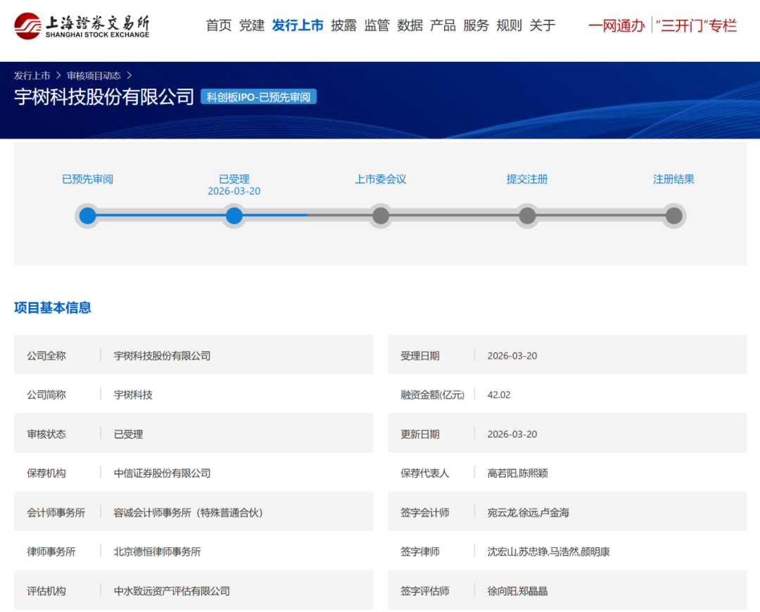 3月20日,上交所官网显示,宇树科技股份有限公司(下称“宇树科技”)科创板IPO申请已获受理。这是科创板IPO“预先审阅”机制落地的第二单项目,也意味着A股市场有望迎来“人形机器人第一股”。