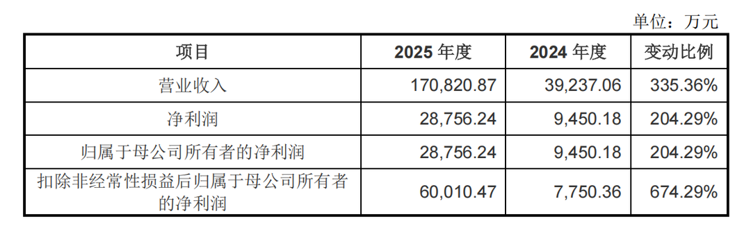 宇树科技披露的招股书显示,公司业绩近年来实现跨越式增长。2022年至2024年,宇树科技分别实现营业收入1.23亿元、1.59亿元、3.92亿元。2025年,公司营业收入进一步攀升至17.08亿元,同比增长335.36%;同期实现扣非后净利润达6亿元,同比增长674.29%,成为全球高性能通用机器人行业中少数实现规模化销售与盈利的企业。