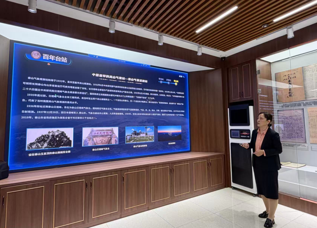 山东省气象局高级工程师陈益玲在气象档案馆讲解泰山气象观测站情况