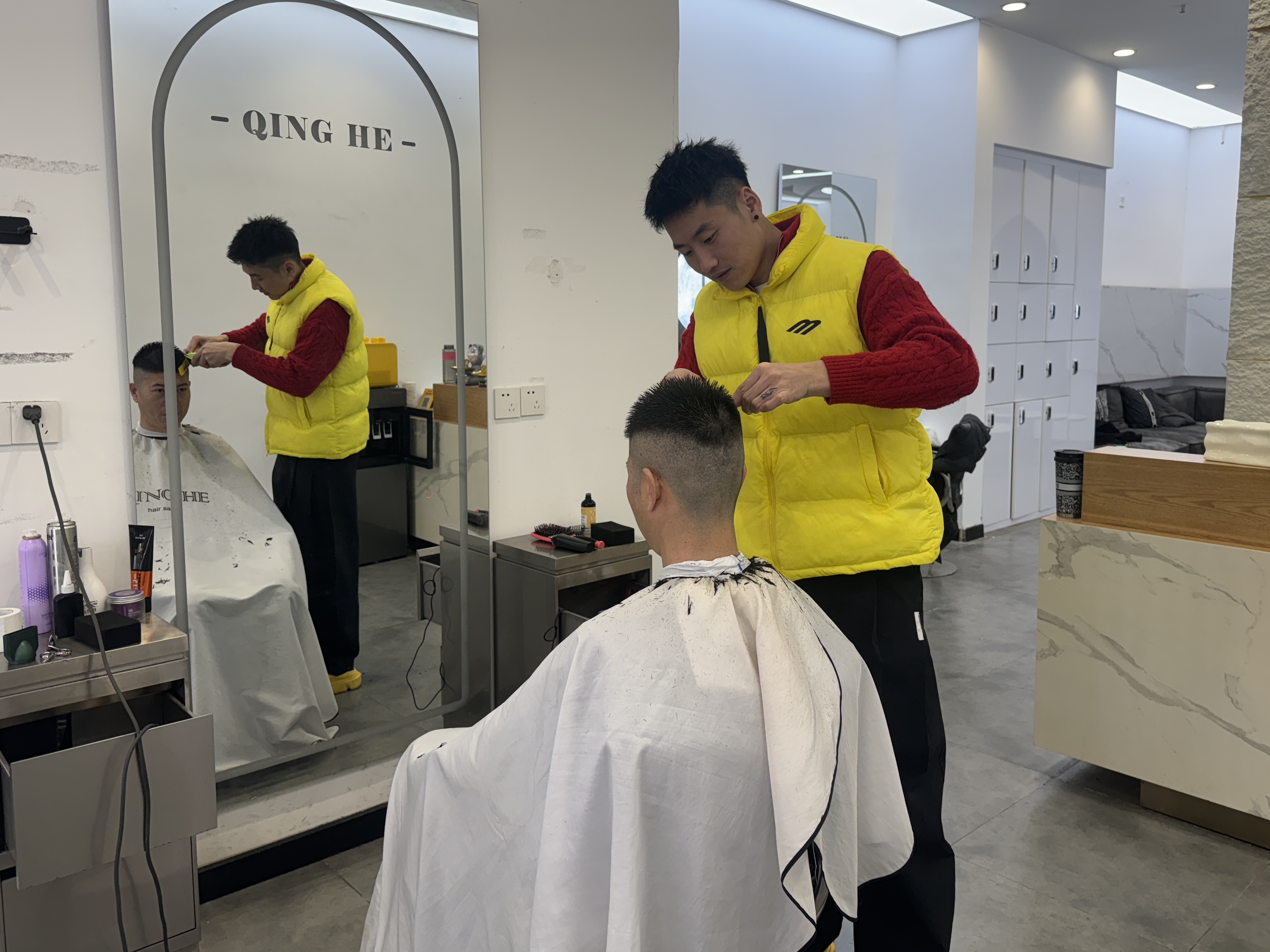 李沧区宾川路TT造型Salon老板萧先生在给第一位到店的顾客理发