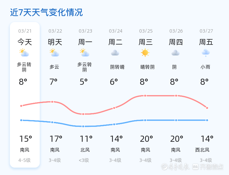 今天是3月21日,星期六,农历二月初三。威海市今日天气多云转阴,气温在8℃到15℃之间,西南风2级,空气湿度44%,PM2.5指数56。各区天气情况基本一致,市民出行需注意天气变化。明日本市天气转为多云,气温有所上升,最高气温可达17℃,最低气温7℃,风力增强至3-4级。未来三天,威海天气将呈现多云转阴、阴转晴的变化趋势,气温波动较大,最低气温5℃,最高气温20℃。周三有小雨,市民需注意出行安全。温馨提示