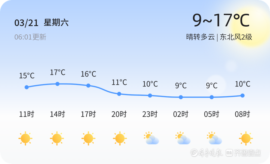 今天是3月21日,星期六,农历二月初三。枣庄市今日天气以晴转多云为主,气温在5.6℃左右,东北风2级,空气湿度92%。各区县天气情况基本一致,整体呈现晴好后转多云的趋势,市民出行可提前关注天气变化,适时增减衣物。
