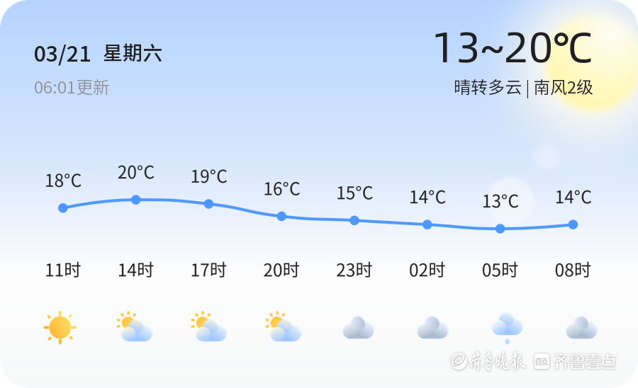 今天是3月21日,星期六,农历二月初三。淄博市今日天气晴转多云,气温适中,最高气温20摄氏度,最低气温13摄氏度。目前实时温度7摄氏度,南风2级,空气湿度72%。空气质量方面,PM2.5指数为140,属于中度污染,建议市民减少外出,尤其是老人、儿童等敏感人群。今日天气晴朗,适合户外活动,但请注意防晒和补水。未来三天,淄博市天气趋势总体平稳。周六天气晴朗,气温适宜,适合户外活动;周日多云转小雨,气温略有下降,最低气温10摄氏度,最高气温20摄氏度。降雨可能导致道路湿滑,提醒市民出行注意交通安全,随身携带雨具。周一多云,气温回升至8到21摄氏度,但风力较大,阵风可达3-4级,建议市民注意防范高空坠物等安全隐患。温馨提示