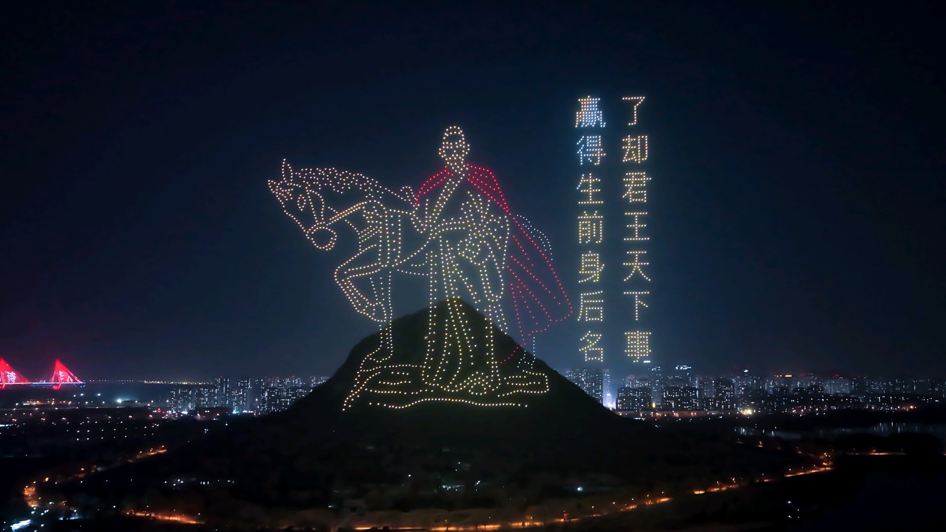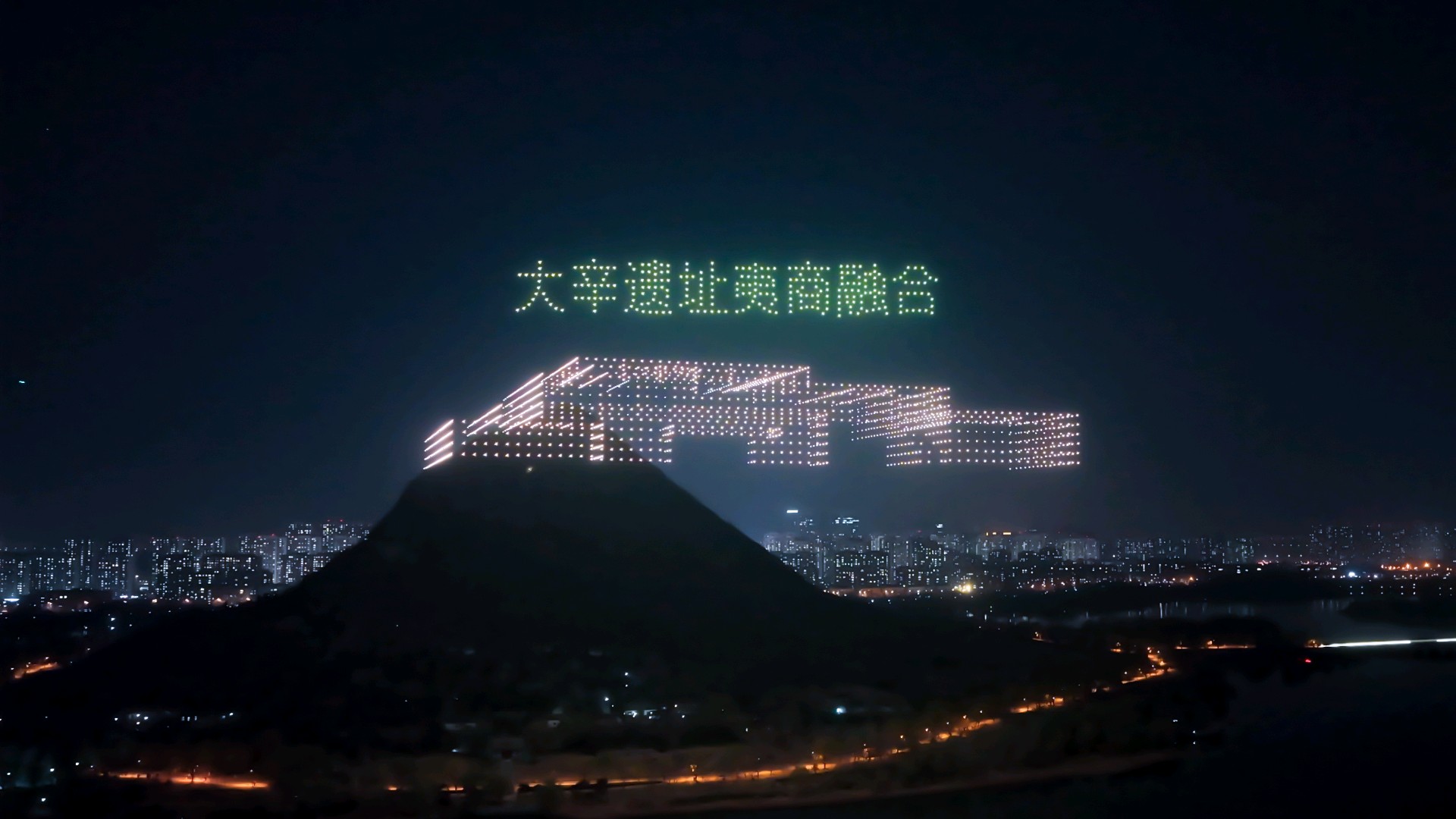 表演在“鹊华秋色图”的水墨意境中启幕,无人机编队勾勒出鹊华山水的经典轮廓,水墨光影交融间,瞬间唤醒历城千年齐鲁文脉;紧接着,大辛庄遗址博物馆的轮廓灵动浮现,辛弃疾的经典形象熠熠生辉,历史符号与人文风骨在夜空中交织,尽显“齐鲁首邑”的历史厚重。