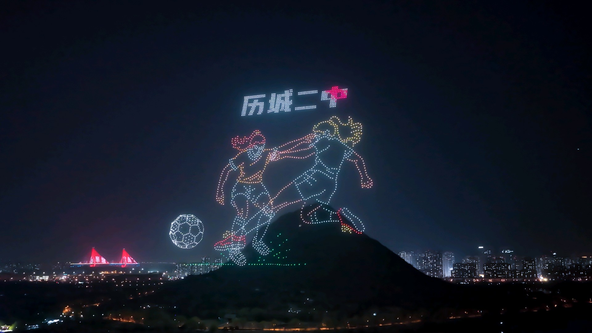 光影流转间,画面切换至教育与乡村振兴篇章:“历城二中”的字样闪耀夜空,女足队员抢球射门的灵动场景栩栩如生,彰显历城教育的蓬勃生机与体育活力;恣在历城、山水彩石、泉水草莓的LOGO依次点亮,历城城发、酷玩星球呼啸谷、芦南村的特色图景接连铺展,一幅城乡融合、乡村振兴的幸福画卷在夜空中徐徐展开。
