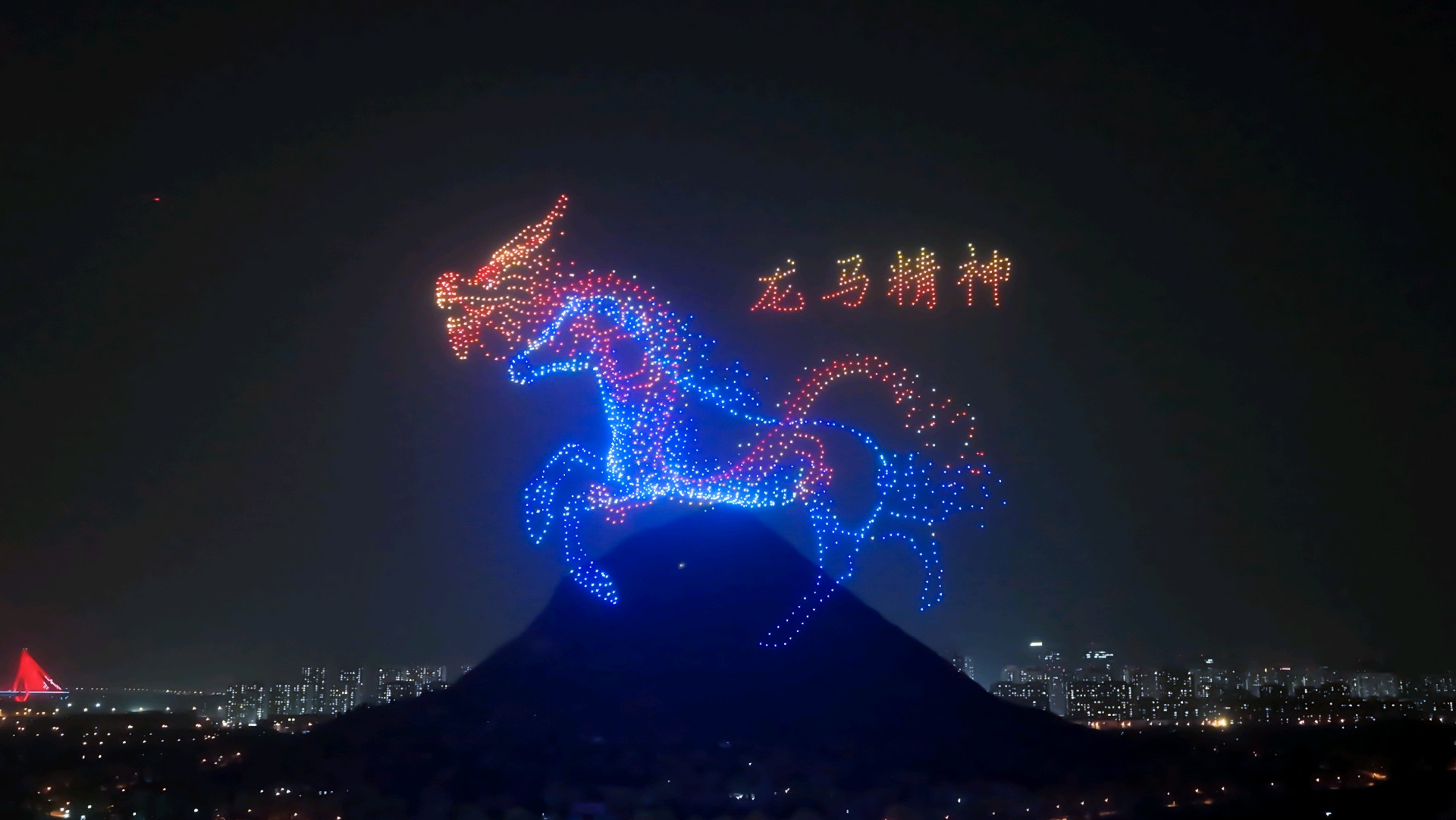 最让现场观众连连称绝的,当属“龙马精神”的震撼演绎。无人机编队勾勒出龙马昂首腾跃的磅礴场景,鳞爪飞扬、光影交错间,恰是对历城人民奋勇争先、昂扬向上精神风貌的生动诠释;表演最后,“历城人民欢迎你”的暖心字样缓缓浮现,温暖的光影点亮整片夜空,现场欢呼声、掌声此起彼伏,将氛围推向最高潮。