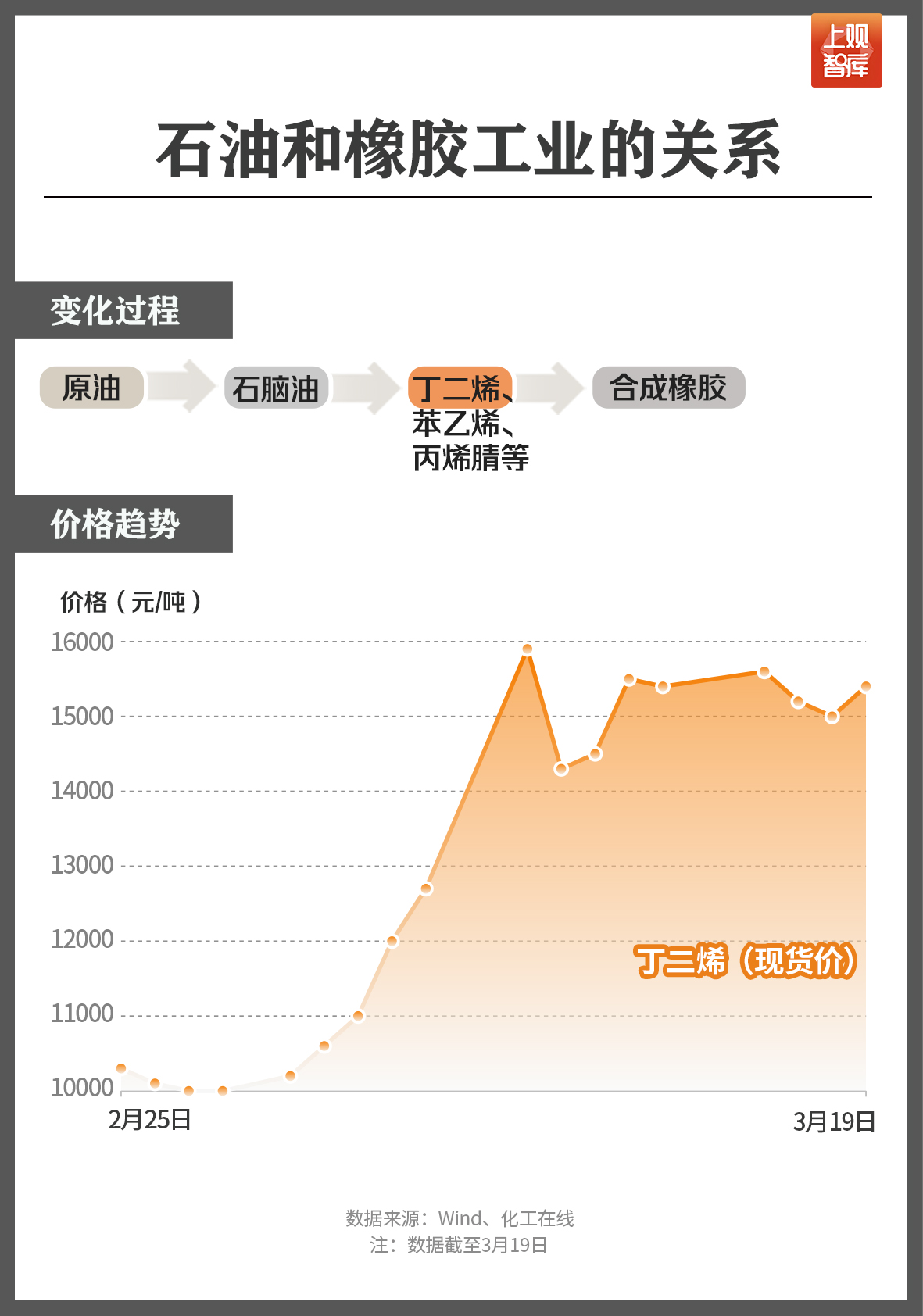 另一个重要的化工产品是合成橡胶,目前丁苯橡胶、丁二烯橡胶是世界合成橡胶的前两大胶种。数据显示,丁二烯价格近期已飙升至每吨15000元。