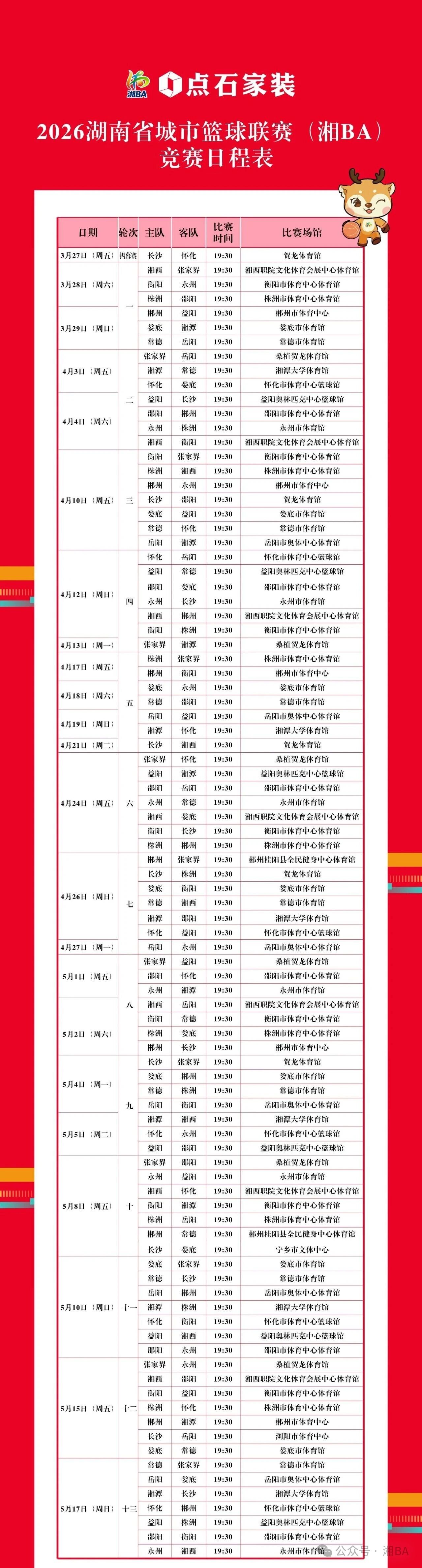 湘BA完整赛程公布!3月27日揭幕战长沙队坐镇贺龙体育馆迎战怀化队潇湘晨报 2026-03-21 09:31:343月20日,湖南省城市篮球联赛官方微信公众号发布23个比赛日的完整赛程,3月27日揭幕战,长沙队将坐镇主场贺龙体育馆迎战怀化队。完整赛程如下:(潇湘晨报)责任编辑:崔可腾