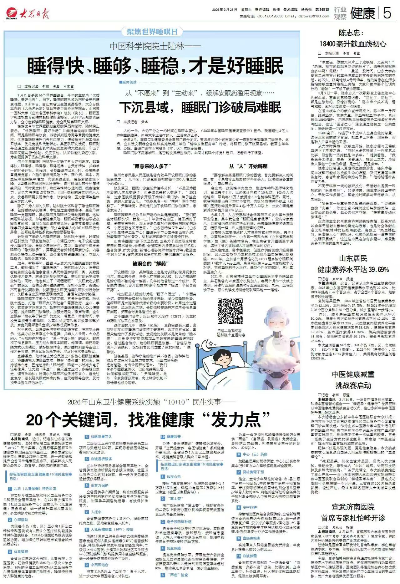3月21日是第26个世界睡眠日,今年的主题为“优质睡眠,美好生活”。当下,睡眠问题已成为困扰全民的健康难题。3月19日,由山东省卫生健康委指导、大众日报主办的《大众名医馆》栏目特邀中国科学院院士、山东第一医科大学(山东省医学科学院)校长(院长)、睡眠医学领域权威专家陆林教授做客直播间,从科学认知到实践方法,全方位解读睡眠健康,为全民科学睡眠支招。