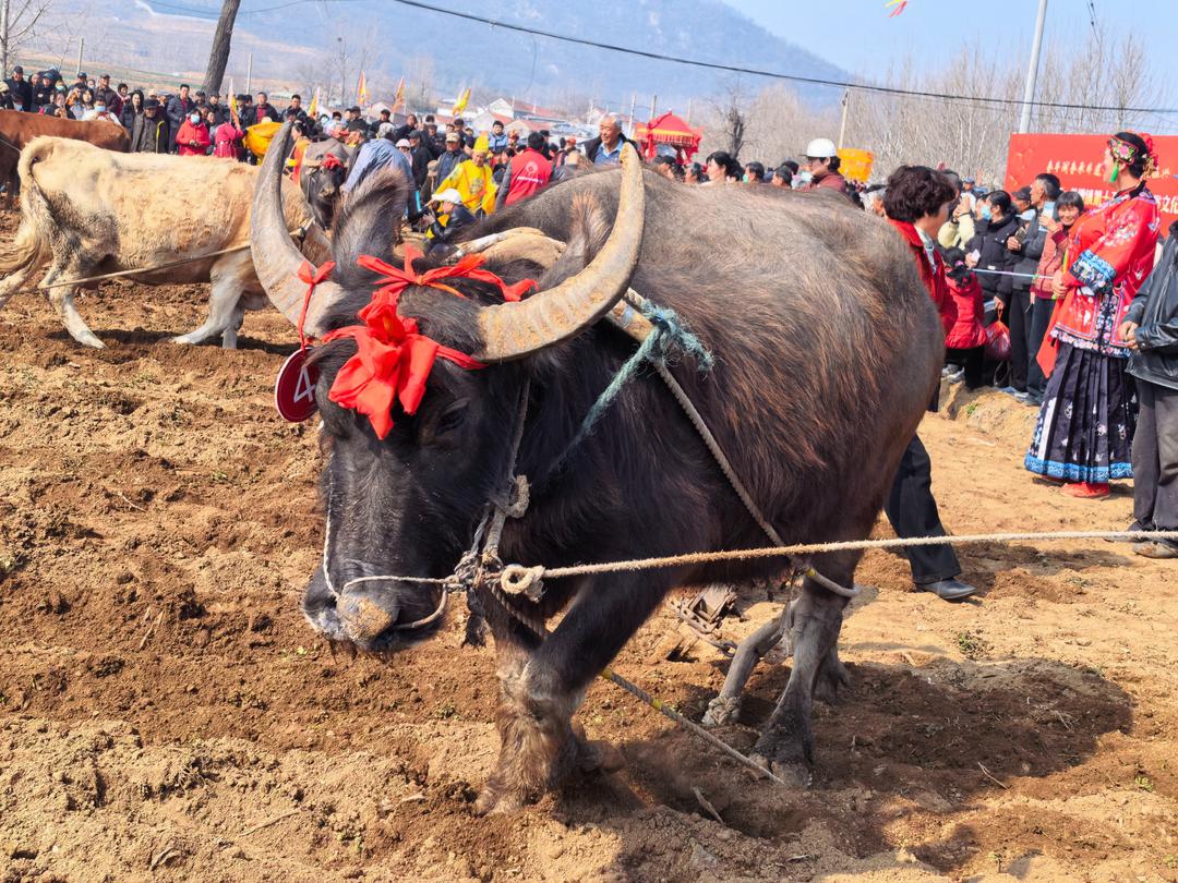 在黄墩镇,耕牛并未完全退出农耕舞台。山岭薄地的现实地貌,让牛耕成为机械化耕作的重要补充。葛疃村74岁的山长亮,从20来岁便开始使牛,如今家里仍养着两头牛,一头十几岁,一头三岁。今年二月二,他特意带着小牛来参加闹春牛。“养久了有感情,不养反倒不习惯。”谈起自家的牛,山长亮满是温情,“春天开果子(花生)沟,秋天种麦子,边边棱棱的山地,机械上不去,还得靠它们。”