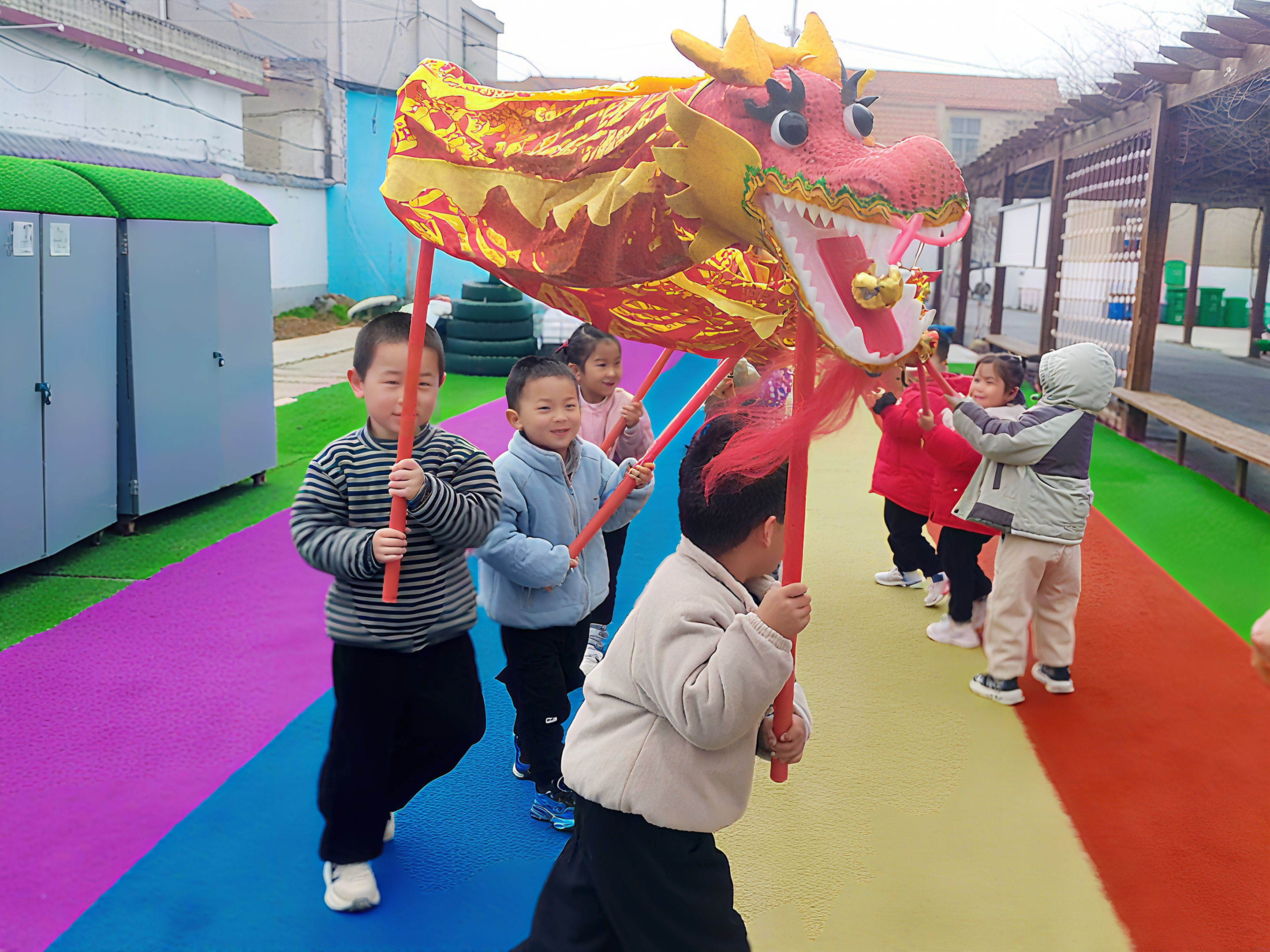 巨型传统舞龙亮相校园,瞬间点燃孩子们的热情。孩子们兴高采烈地手持龙身,迈着欢快的步伐,跟着节奏摇摆舞动,蜿蜒起伏的龙身在孩子们的手中栩栩如生、气势十足。孩子们在欢声笑语中体验舞龙的乐趣,近距离感受非遗文化的魅力,也在团队协作中体会到团结的力量,让传统龙韵在校园里尽情绽放。