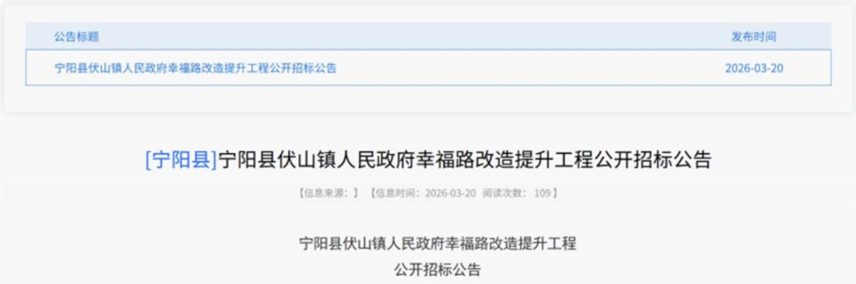 近日,据泰安公共资源交易中心发布的消息,宁阳县伏山镇人民政府幸福路改造提升工程正式开始招标,招标控制价约610万元,项目路线长度约8公里,将进行挖补、部分加宽,并铺设沥青。