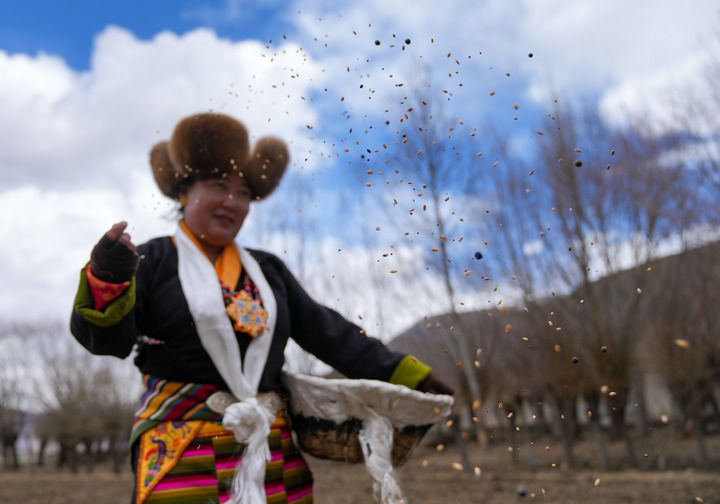 2026年3月16日,西藏山南市结巴乡结巴村村民身着盛装,在新犁开的田地上播撒种子。