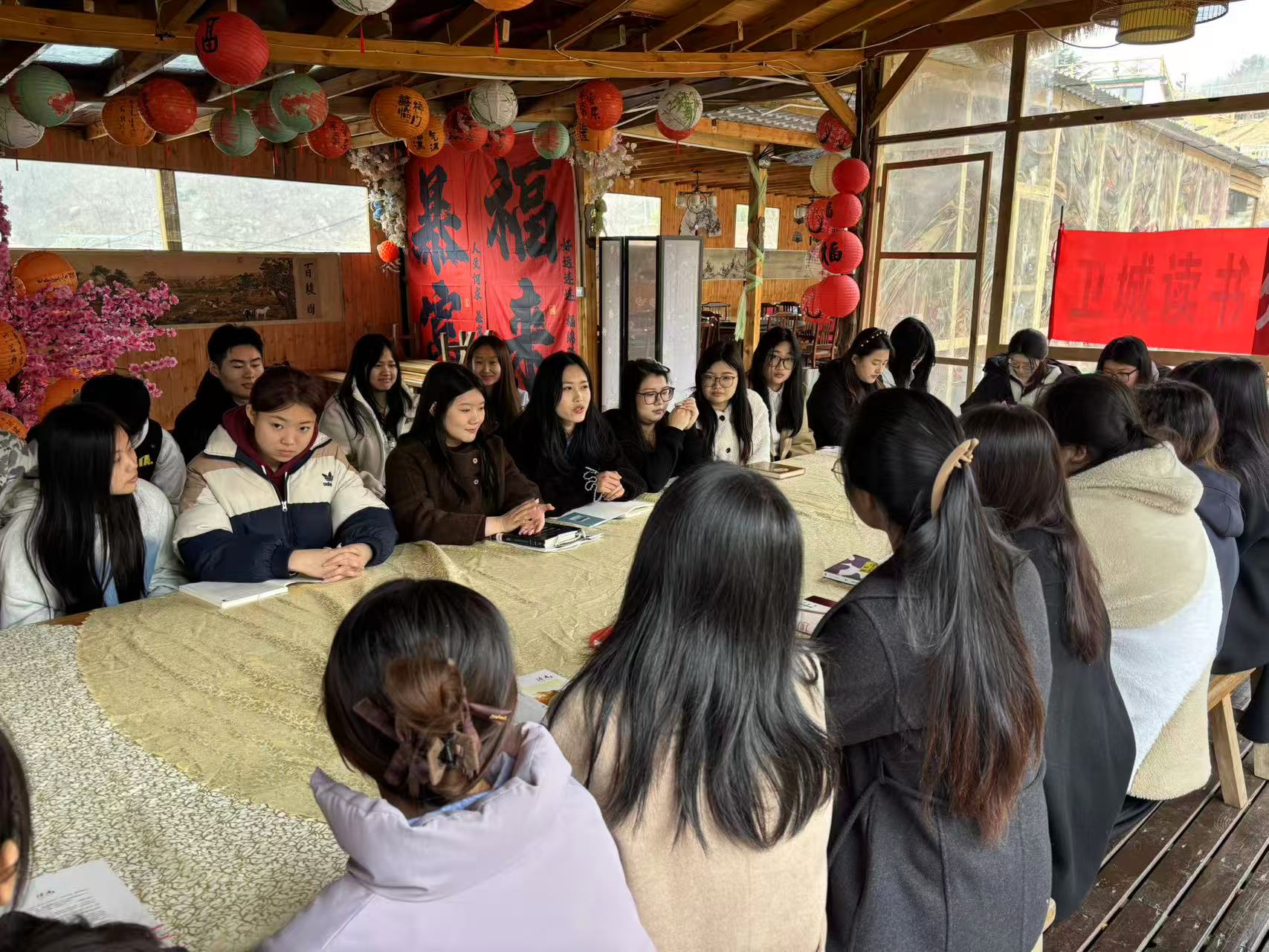 屋外是漫山花开,屋内是墨香阵阵,不少游客也被吸引进来,坐下静静地读上半本书,享受这难得的春日慢时光。一旁的诗词角,则成为最受欢迎的拍照打卡背景墙,让传统文化以更轻松的方式融入游玩。