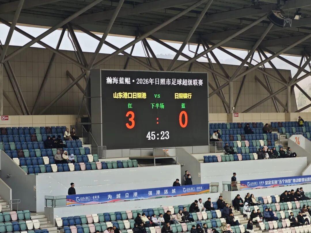 3月21日下午3时,日照国际足球中心迎来瀚海蓝鲲·2026年日照市足球超级联赛开幕暨揭幕战活动,山东港口日照港足球队与日照银行足球队联袂以精彩对决,开启了一场属于日照人的足球盛宴。上半场比赛,山东港口日照港足球队3:0日照银行足球队。