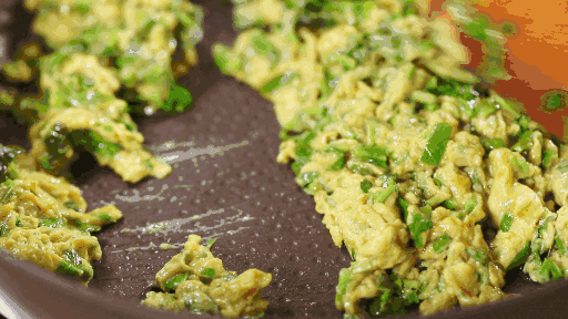 焯过水的香椿切末,与鸡蛋液搅匀,入锅翻炒至金黄,撒点盐即可。鸡蛋裹着翠绿的香椿,香气扑鼻,口感软嫩,配着米饭能多吃两碗,这口鲜香,只有春天才能吃到!