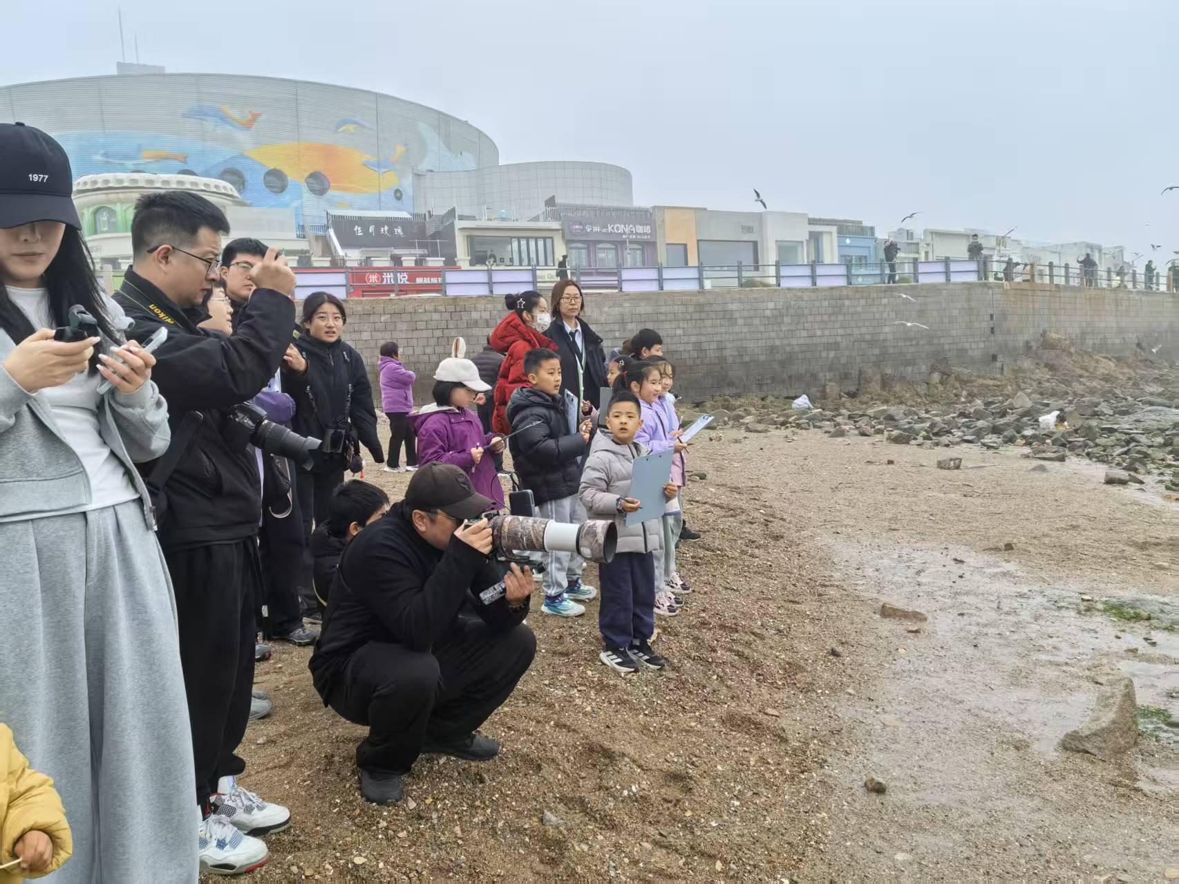 活动内容丰富且兼具趣味性与科普性,主要分为四大环节。一是初识鸥类,工作人员带领孩子们观察极地海洋世界附近活动的鸥类,系统学习红嘴鸥、黑尾鸥、西伯利亚银鸥、灰背鸥等青岛常见鸥种的区分方法,帮助孩子们快速识别不同鸥种的典型特征;二是探寻海鸥的秘密,深入讲解这些“飞行家”的生活习性与迁徙规律,让孩子们感受它们跨越千里来青越冬的生命奇迹,了解青岛“挽留海鸥行动”三十余年的传承与成效;三是互动观察,在带队老师指导下,孩子们在安全距离内使用望远镜观察海鸥的形态特征和行为,完成趣味观察任务卡,在实践中掌握科学的生态观测方法;四是总结分享,小朋友们主动分享自己的观察发现,巩固所学知识,传递护鸥心声,现场氛围热烈。