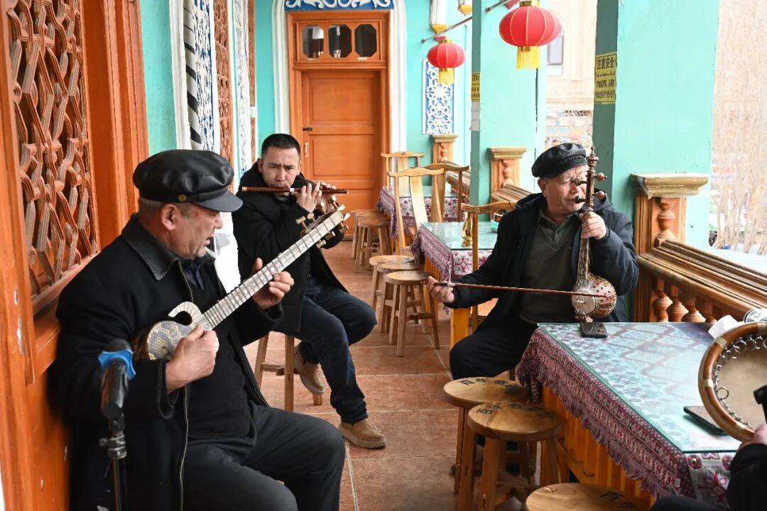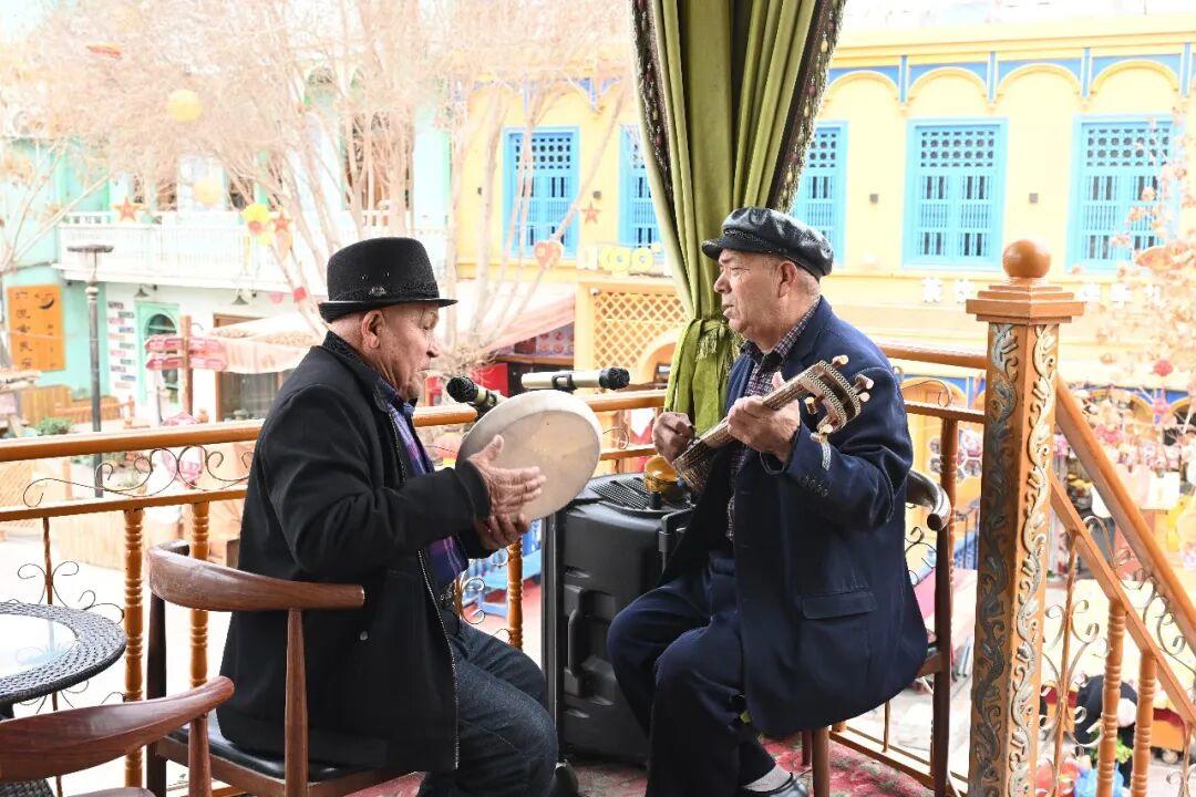 谈话间,一位老人从墙上取下一把热瓦普,融入了每日相聚于此的乐队中。琴声一响,坐在角落里的另一位老人便默契地拍响了手鼓。没有排练,没有商量,甚至不需要眼神的交流,歌声就起来了。顺势起舞的店员、急忙拿出手机拍照的茶客、窗外驻足聆听的游客……在这里,每一节音符,每一次舞动,每一个微笑,都是对生活最朴素的热爱。