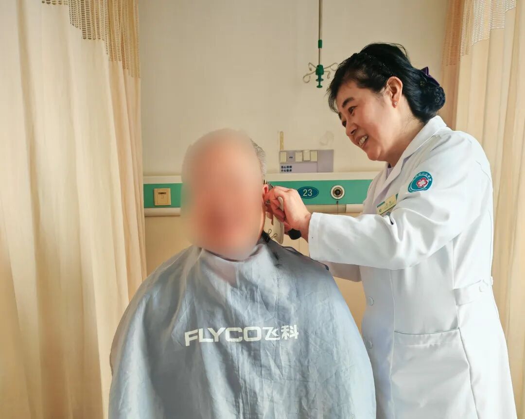 护士一边理发,一边与患者唠家常、普及健康知识。安静的病房里,一时间充满了欢声笑语。