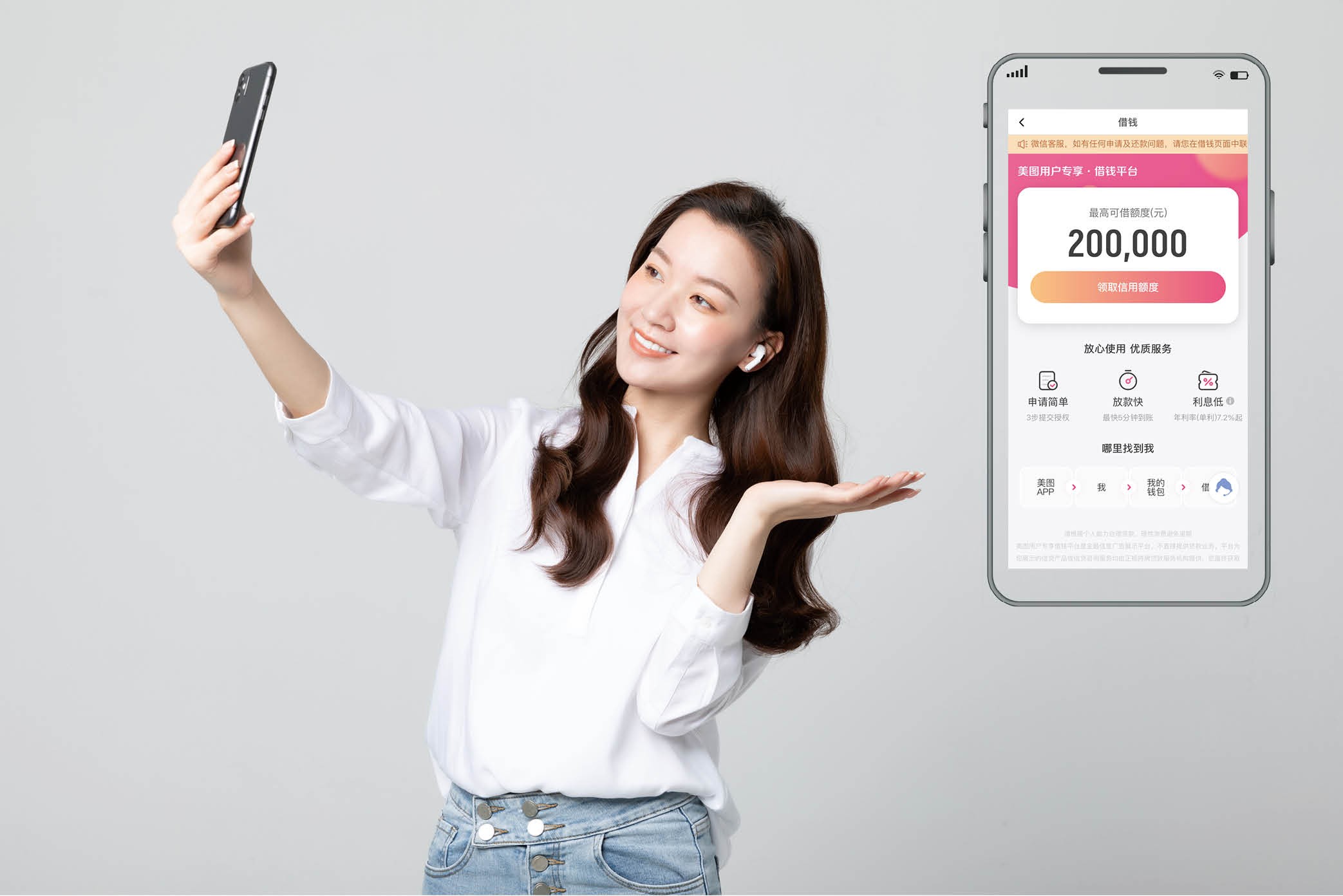 她好奇地点开,屏幕上弹出“美图用户专项借钱平台”字样,要求授权手机号,并显示最高可借额度:200000元。页面有三个简介,她愣住了:“一个修图软件,为什么想借钱给我?”