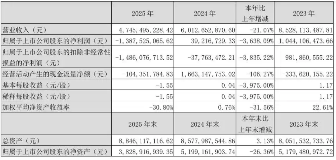 3月20日,纯碱行业龙头山东海化(000822.SZ)公布的2025年年报显示,公司实现营业收入47.45亿元,同比下降21.07%;归属于上市公司股东的净利润亏损13.88亿元,上年同期盈利3921.67万元,同比由盈转亏,降幅达3638.09%。