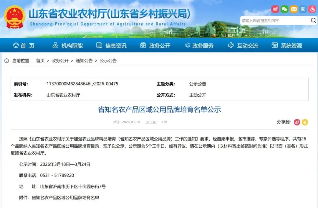 按照《山东省农业农村厅关于加强农业品牌精品培育(省知名农产品区域公用品牌)工作的通知》要求,经自愿申报、各市推荐、专家评选等程序,共有26个品牌纳入省知名农产品区域公用品牌培育目录,省农业农村厅近日进行公示。