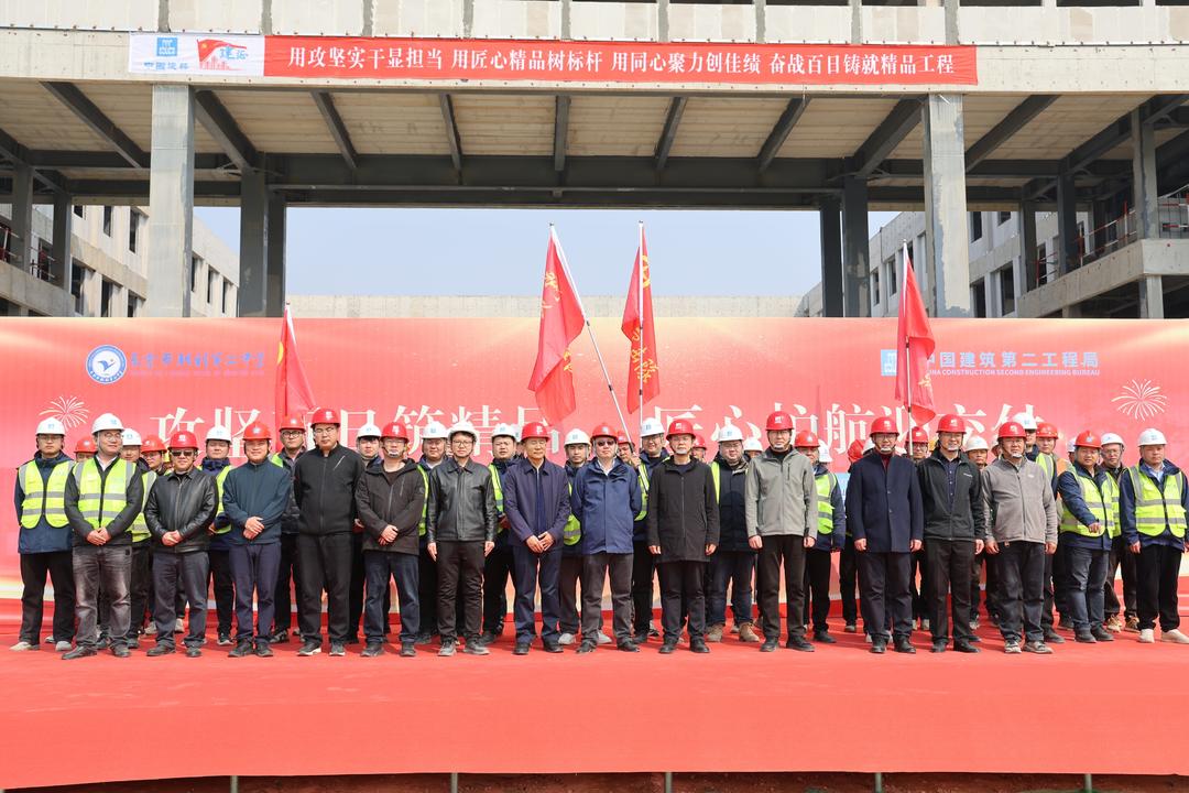 3月20日,中建二局承建的东营市胜利第二中学改扩建项目“百日攻坚”誓师大会在施工现场隆重举行。胜利二中、众成地产项目管理公司、海大监理公司及中建二局等参建单位相关负责人出席活动,全体建设者以昂扬姿态吹响攻坚冲锋号,确保项目六月底如期竣工交付。
