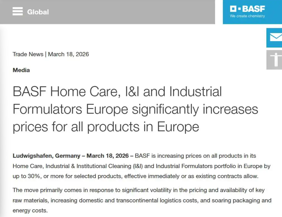 甚至连化工巨头巴斯夫也撑不住要涨价。巴斯夫声明称,将对欧洲地区的家用护理、工业与机构清洁以及工业配方业务组合中的全部产品提价,涨幅可达30%。不过,记者从巴斯夫中国了解到,国内化工产业链韧性较强,各大原料暂时并未调价。