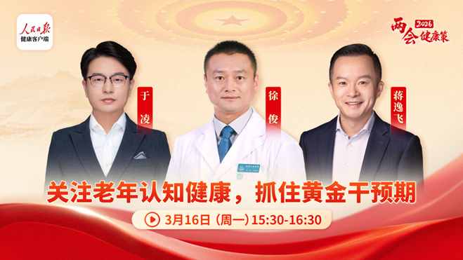 3月16日,人民日报健康客户端“2026两会健康策”直播节目邀请首都医科大学附属北京天坛医院认知障碍科副主任徐俊教授、上海市长宁区老年认知障碍赋能支持中心暨“小蓝花市民中心”主理人于凌、纽迪希亚中国成人医学营养总经理蒋逸飞,共同探讨阿尔茨海默病认知衰退的早期识别与干预。