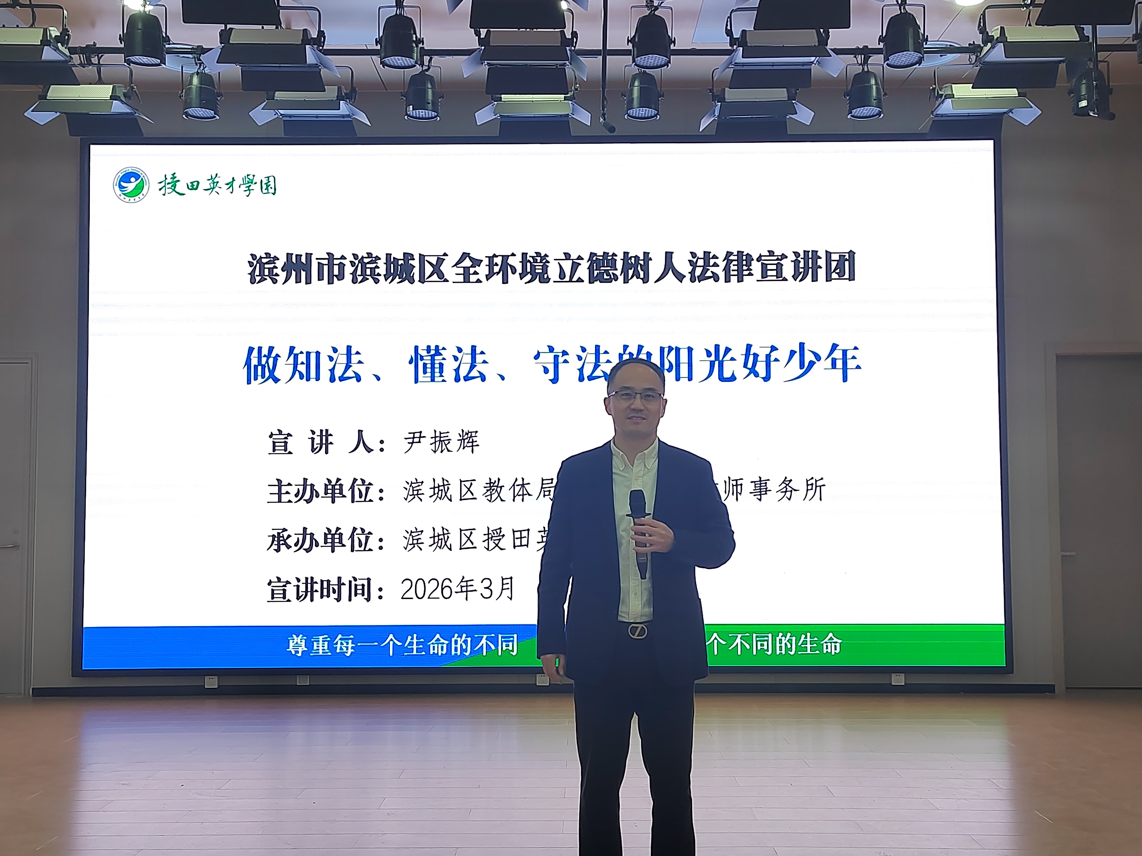 充满活力的滨州授田英才学园,一场别开生面的法律知识宣讲正在热烈展开。今天,我们共同翻开法律这本“超级规则”书,探索如何成为一名阳光好少年。学校邀请到诚功律师事务所尹振辉律师为同学们带来了一场精彩纷呈、通俗易懂的法律启蒙课。