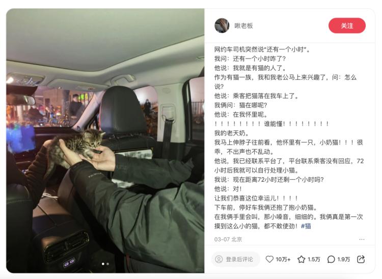 3月7日晚,北京网友“啾老板”在乘坐网约车时,惊讶地发现车上竟然有一只小猫。司机突然说道“我马上是有猫的人了”,话语里充满了喜悦与期待。