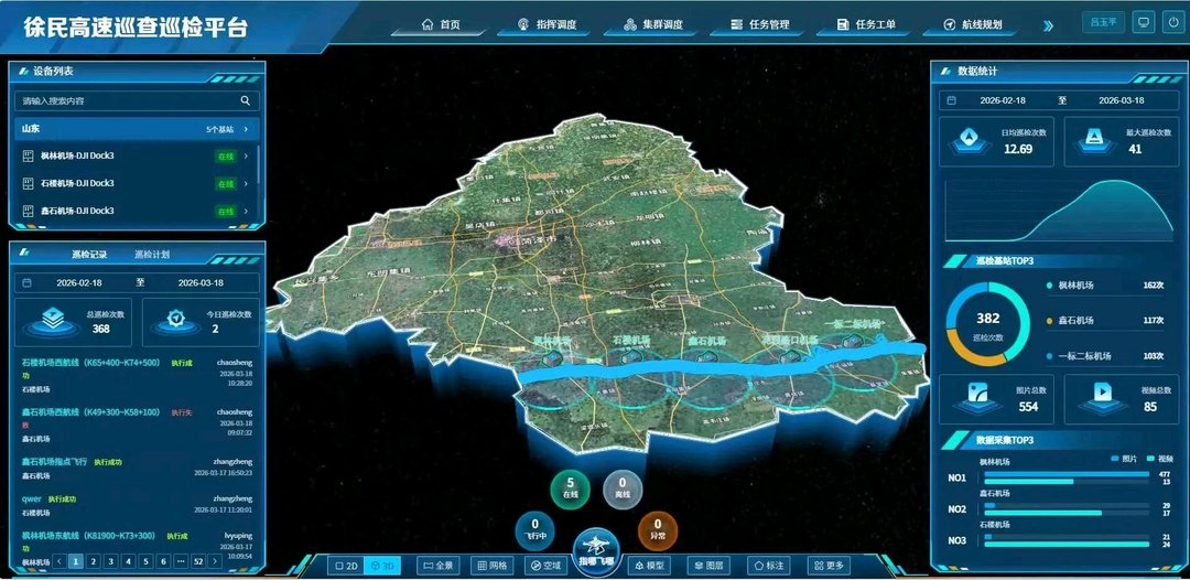 徐民高速单曹段作为连接鲁、苏、豫三省的重要交通动脉,具有线路跨度大、沿线地形复杂、施工节点多且分布广等特点。传统人工巡检模式存在效率偏低、数据反馈滞后、高危区域巡查难度大等短板。为破解这一难题,项目创新引入菏泽交投低空公司自主研发的政务巡查巡检平台,沿线路科学布设5个无人机核心基站,构建起“云平台+无人机场+AI算法”一体化智能巡检解决方案。