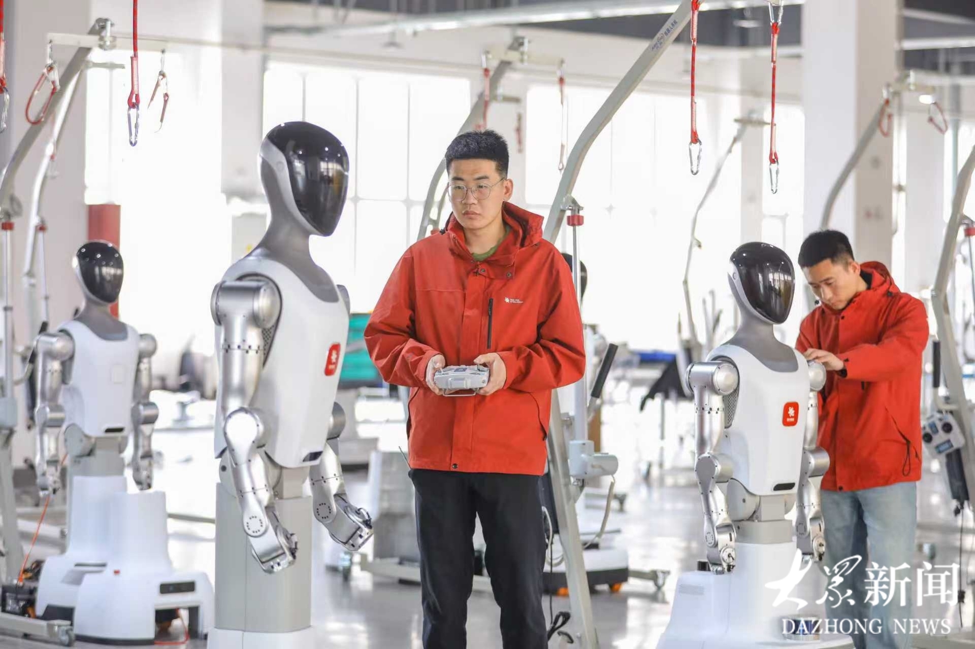 3月18日,位于青岛市李沧区的国华具身智能产业园生产车间,技术人员正调试人形机器人产品,赶制订单,冲刺首季生产“开门红”。据了解,该产业园已形成规模化产能,年产机器人本体1000套,机器人重要部件谐波减速器10万套、行星滚柱丝杠2万套、关节模组5万套,供应小米、京东、千诀等企业。(大众新闻通讯员张鹰)