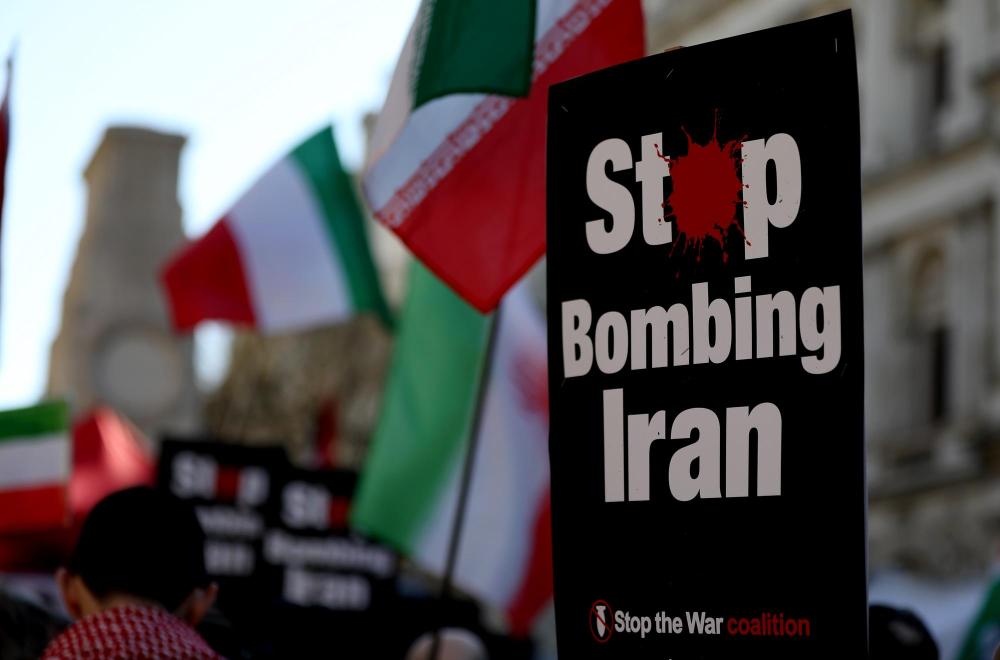 3月21日,人们在英国伦敦参加集会,抗议美国和以色列对伊朗发动军事打击。新华社记者李颖摄
