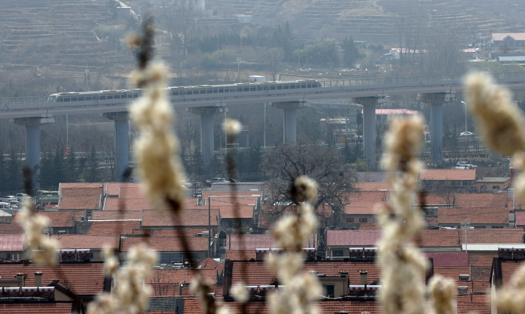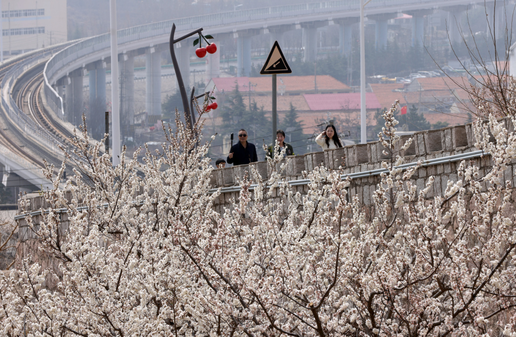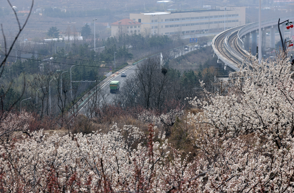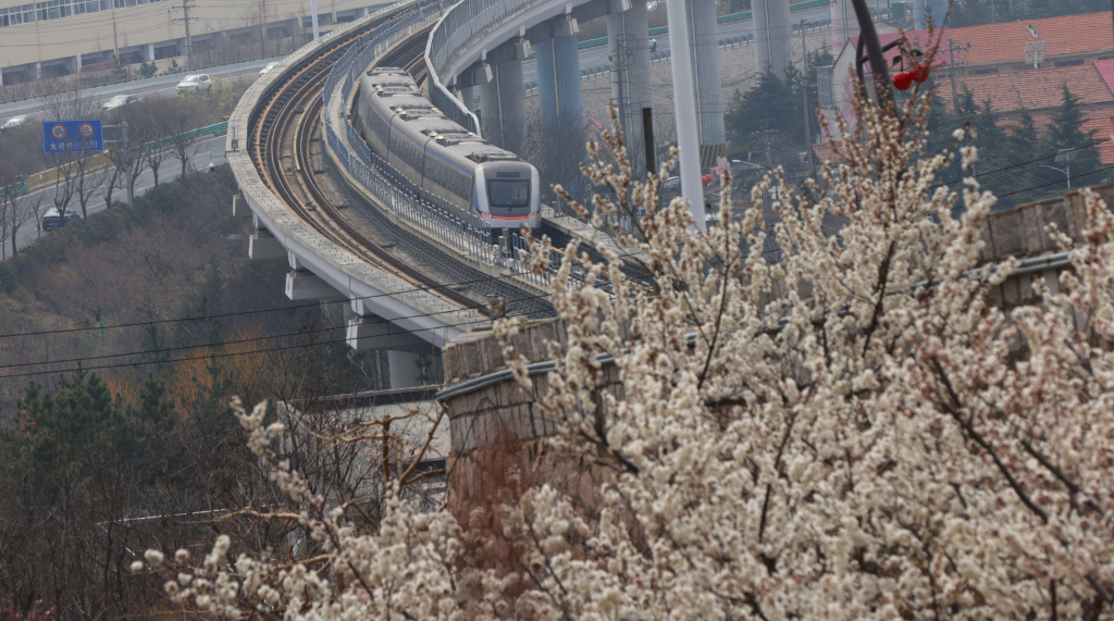 3 月 22 日,恰逢周末,不少市民来到青岛崂山大崂社区山头,打卡穿越花海的地铁 11 号线。每隔约 10 分钟,列车便在樱桃花、杏梅花的簇拥中穿行而过,这里也被网友称作 “开往春天的地铁”。