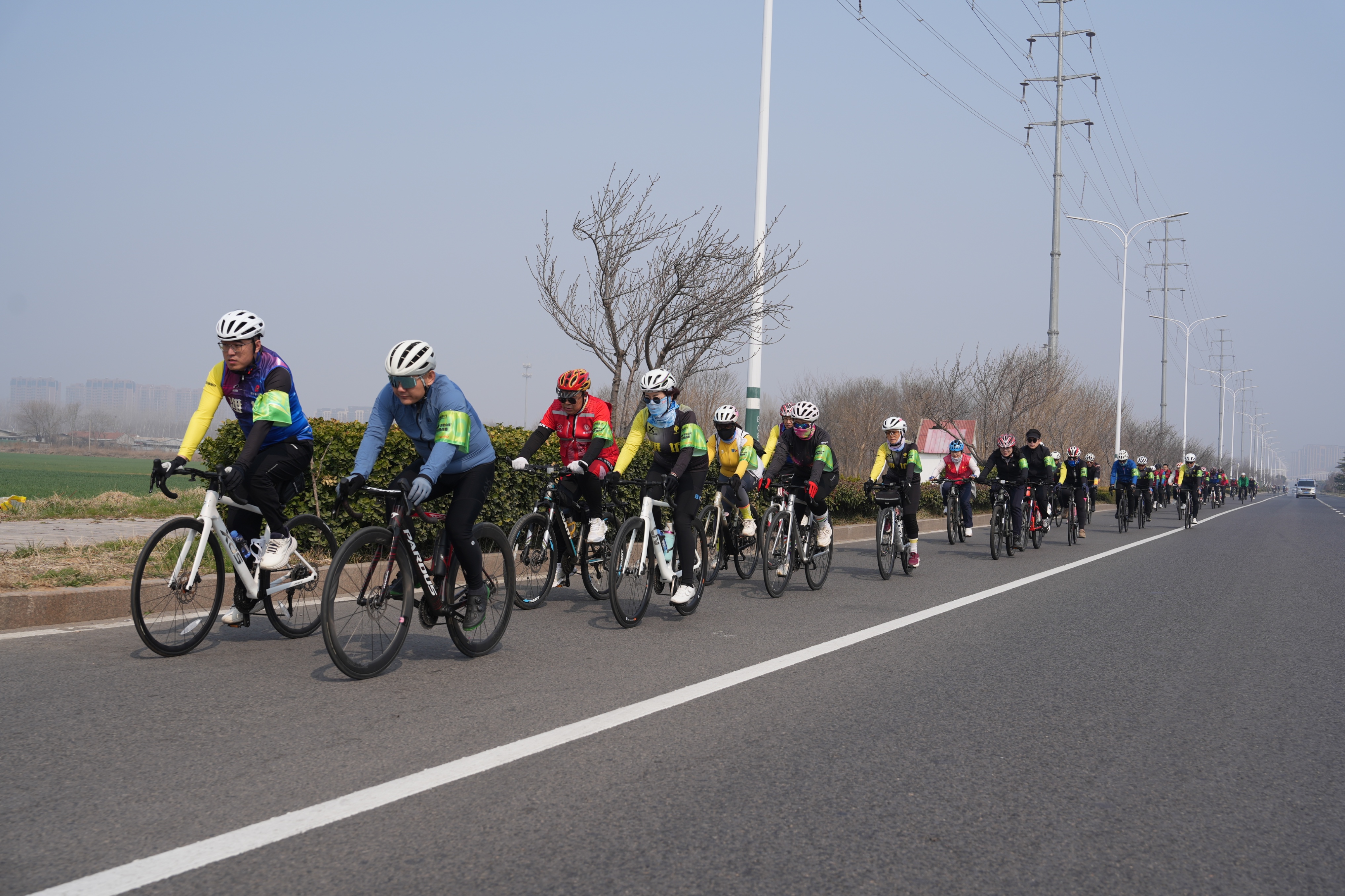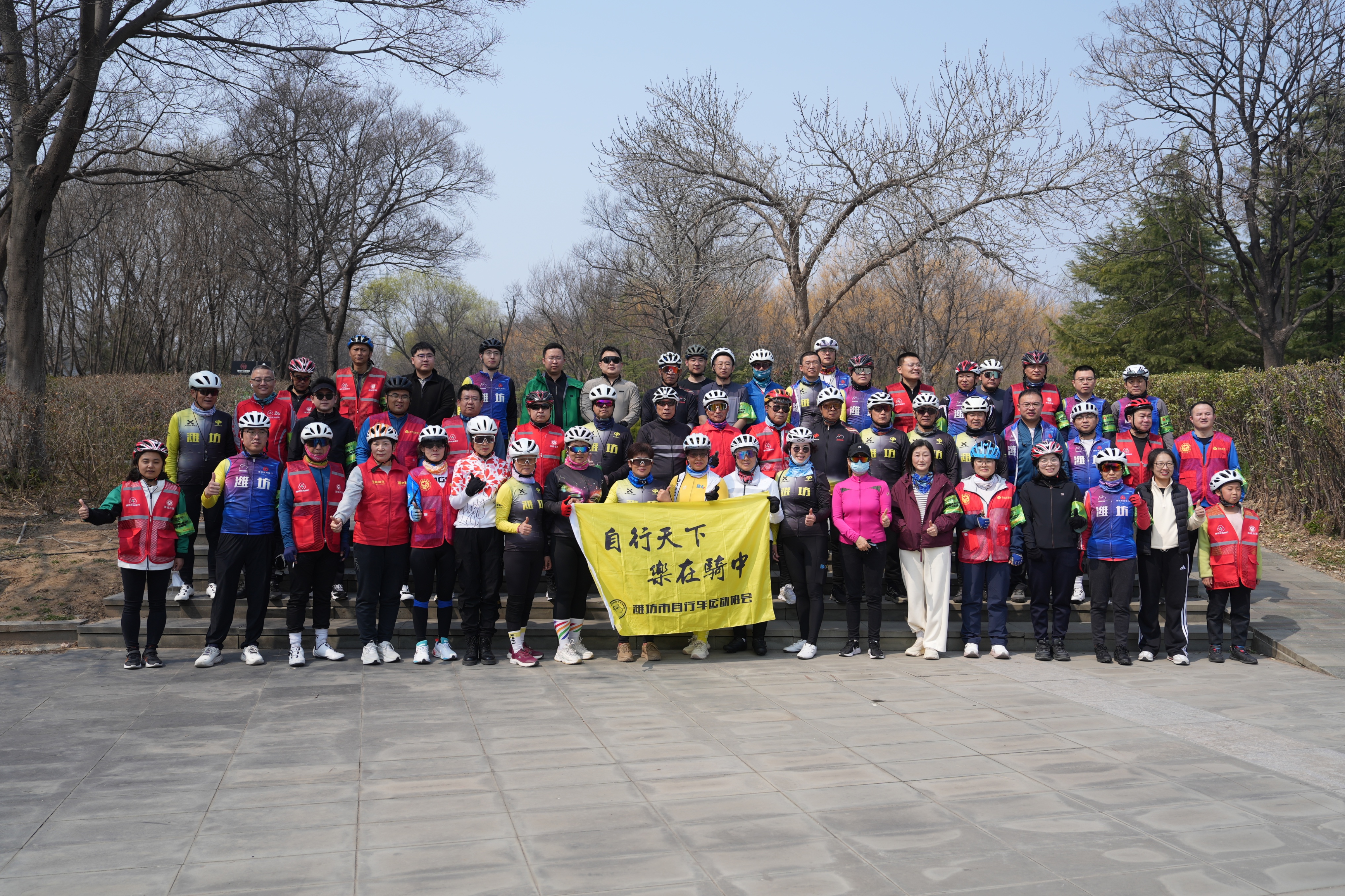 骑行队伍整齐有序,随着队长挥动骑行旗,潍坊农商银行员工及潍坊市自行车协会的骑行爱好者们正式开启一场充满激情活力且富有乐趣的打卡挑战赛之旅。