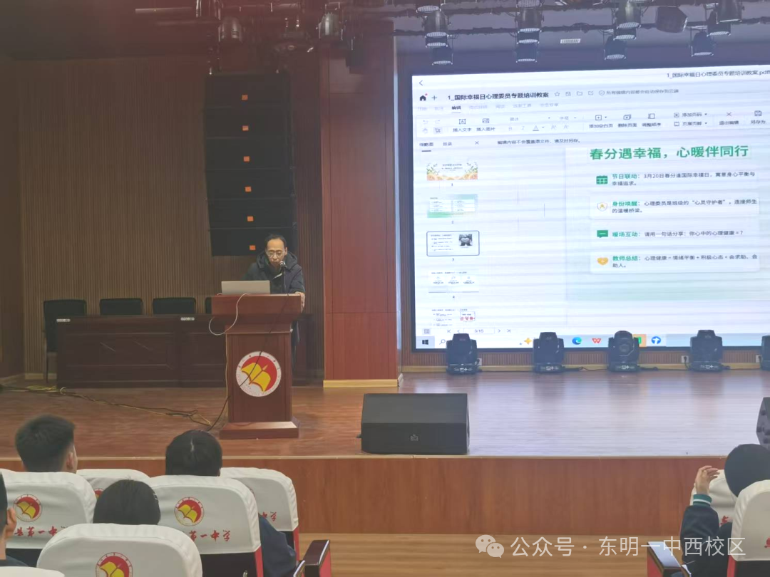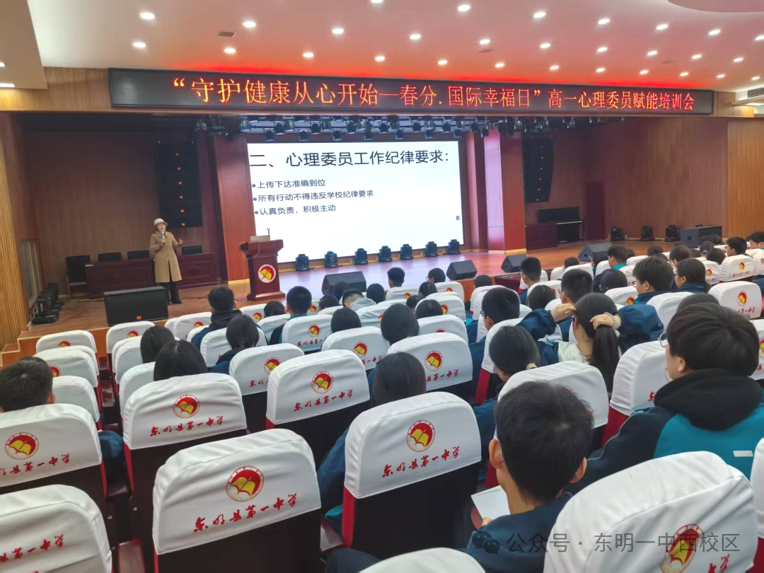 为进一步加强学校心理健康教育队伍建设,提升班级心理委员的专业素养与工作能力,在春分与国际幸福日到来之际,3月20日下午,东明一中西校区高一心理委员专题培训会在综合楼五楼会议室顺利开展。活动由四级部心理广播站长程瑶同学主持,心理老师张海兰、王留忠在活动中同步完成了新学期心理社团社长及干事的选拔工作。